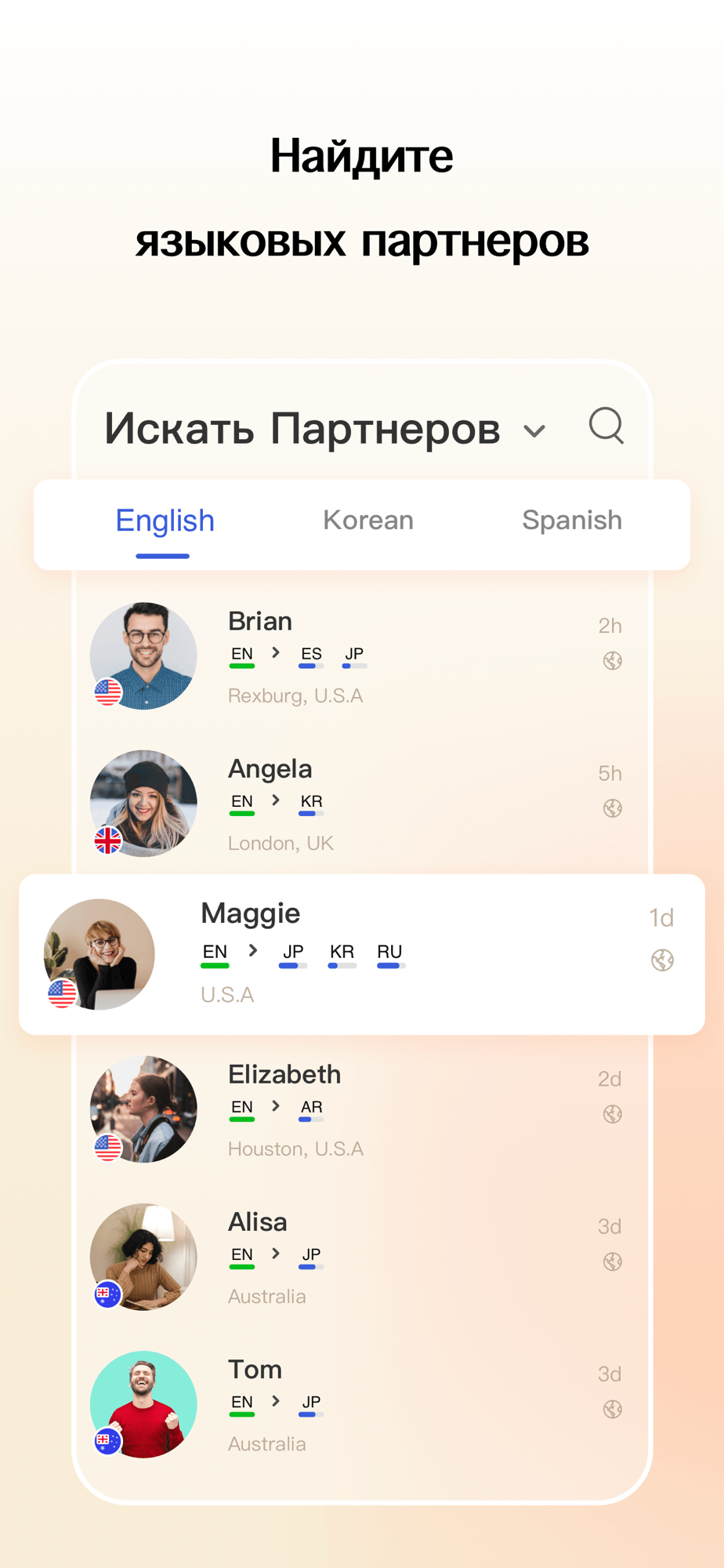 Найдите идеального репетитора языка с помощью Уроков HelloTalk. Ищите в сообществе квалифицированных репетиторов по языку, типу урока и начните свое путешествие по изучению языка с индивидуального занятия!