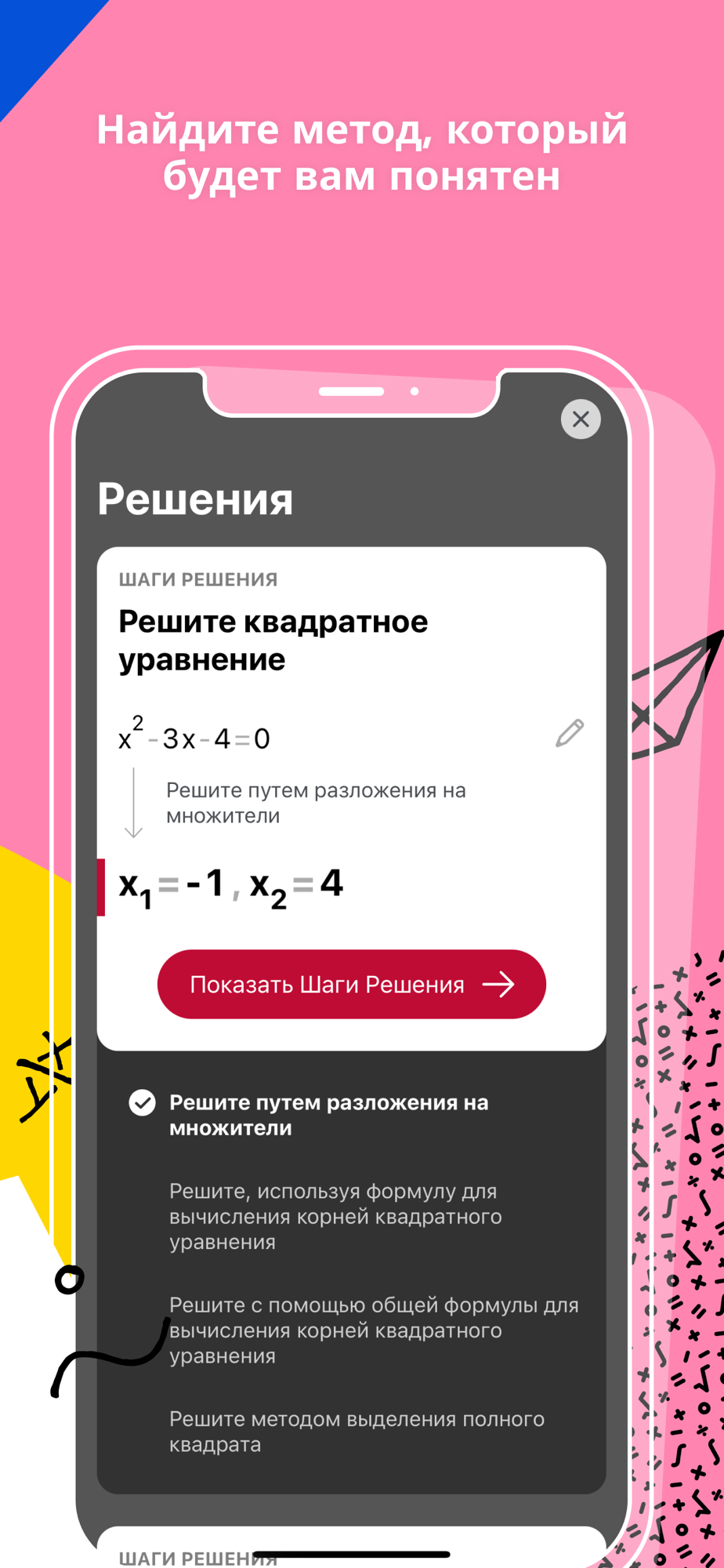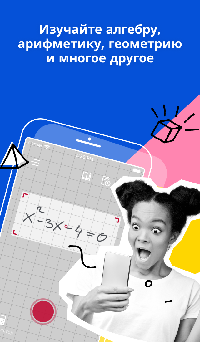 С помощью камеры своего устройства мгновенно отсканируйте печатный текст И рукописные математические задачи или введите и отредактируйте уравнения в нашем научном калькуляторе. Каждую математическую задачу Photomath разбивает на простые, понятные шаги, чтобы Вы могли хорошо понять основные концепции и уверенно отвечать на вопросы.