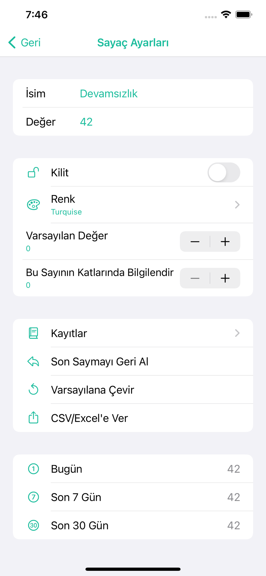 + Sayaç geçmişini Excel veya CSV olarak dışa aktarabilme