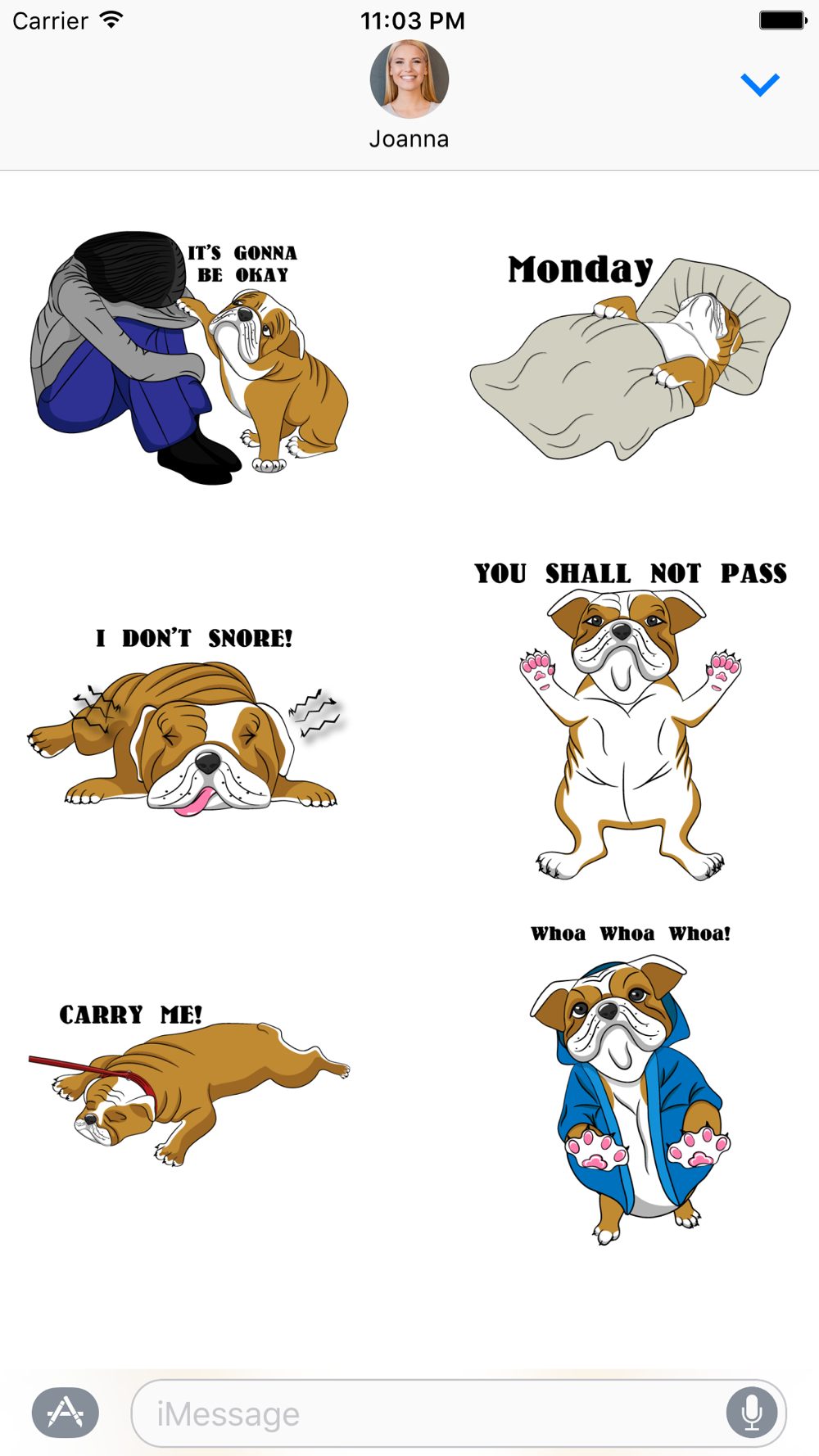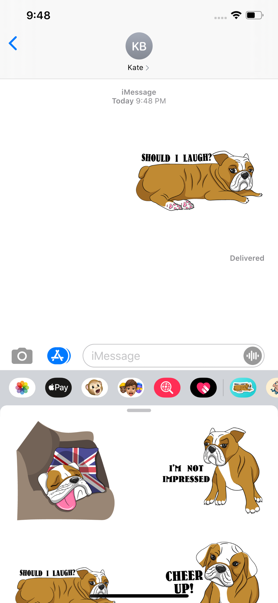- Tap on the button in the bottom left which looks like four dots – you will see your Billy the Bulldog stickers there.