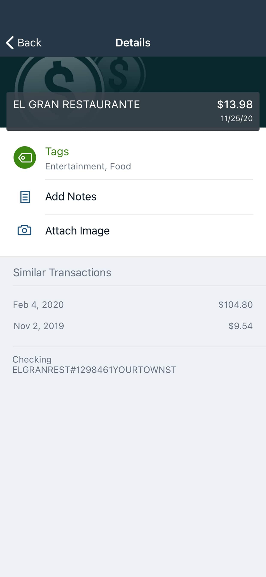 - Keep your transactions organized by allowing you to add tags, notes and photos of receipts and checks.