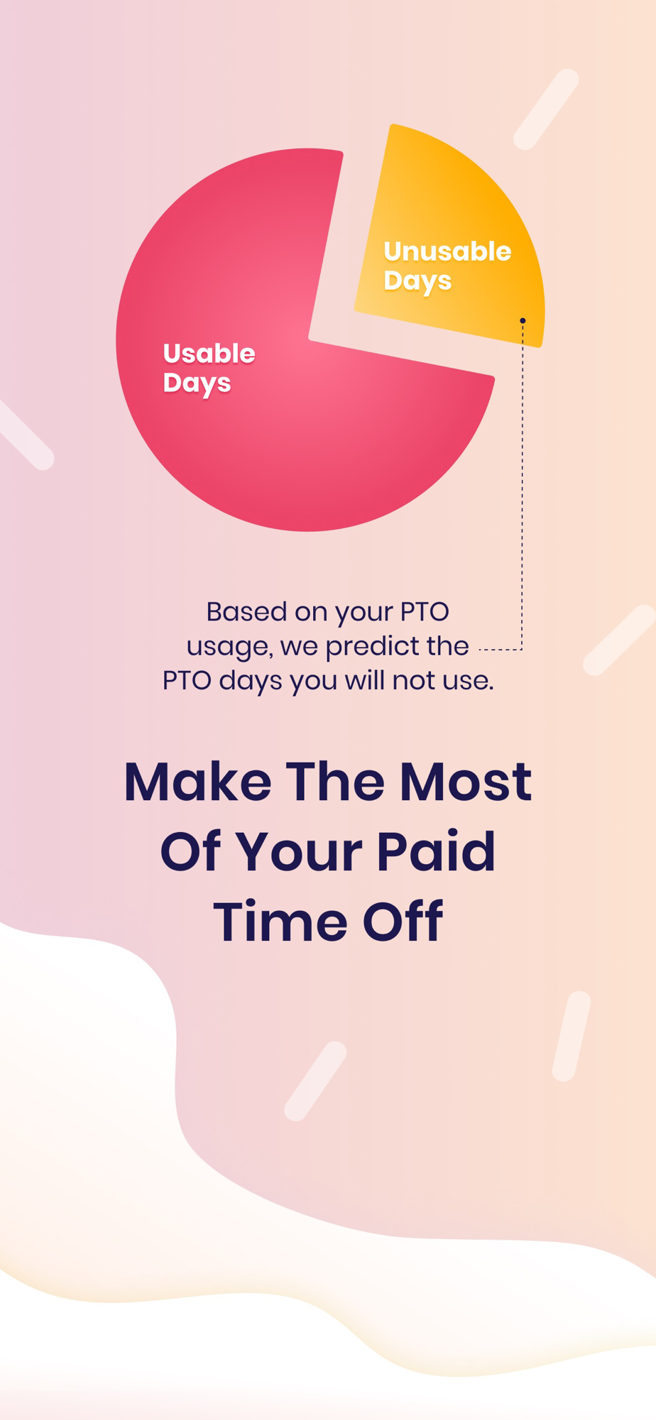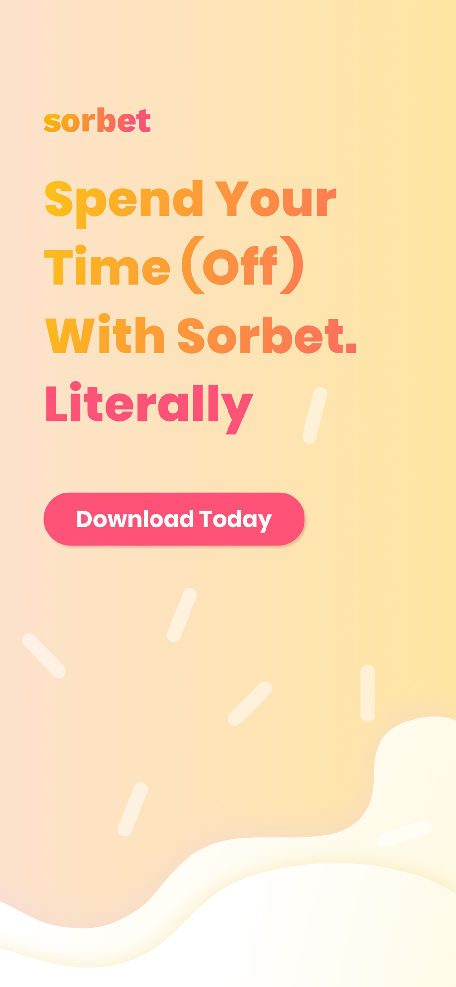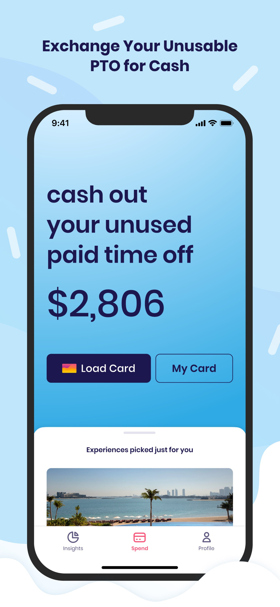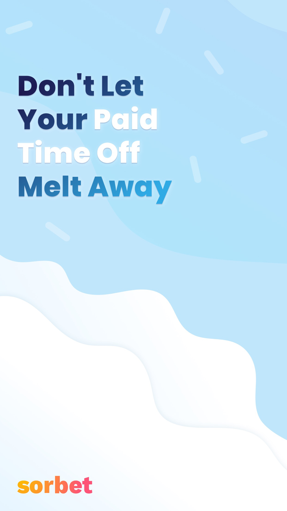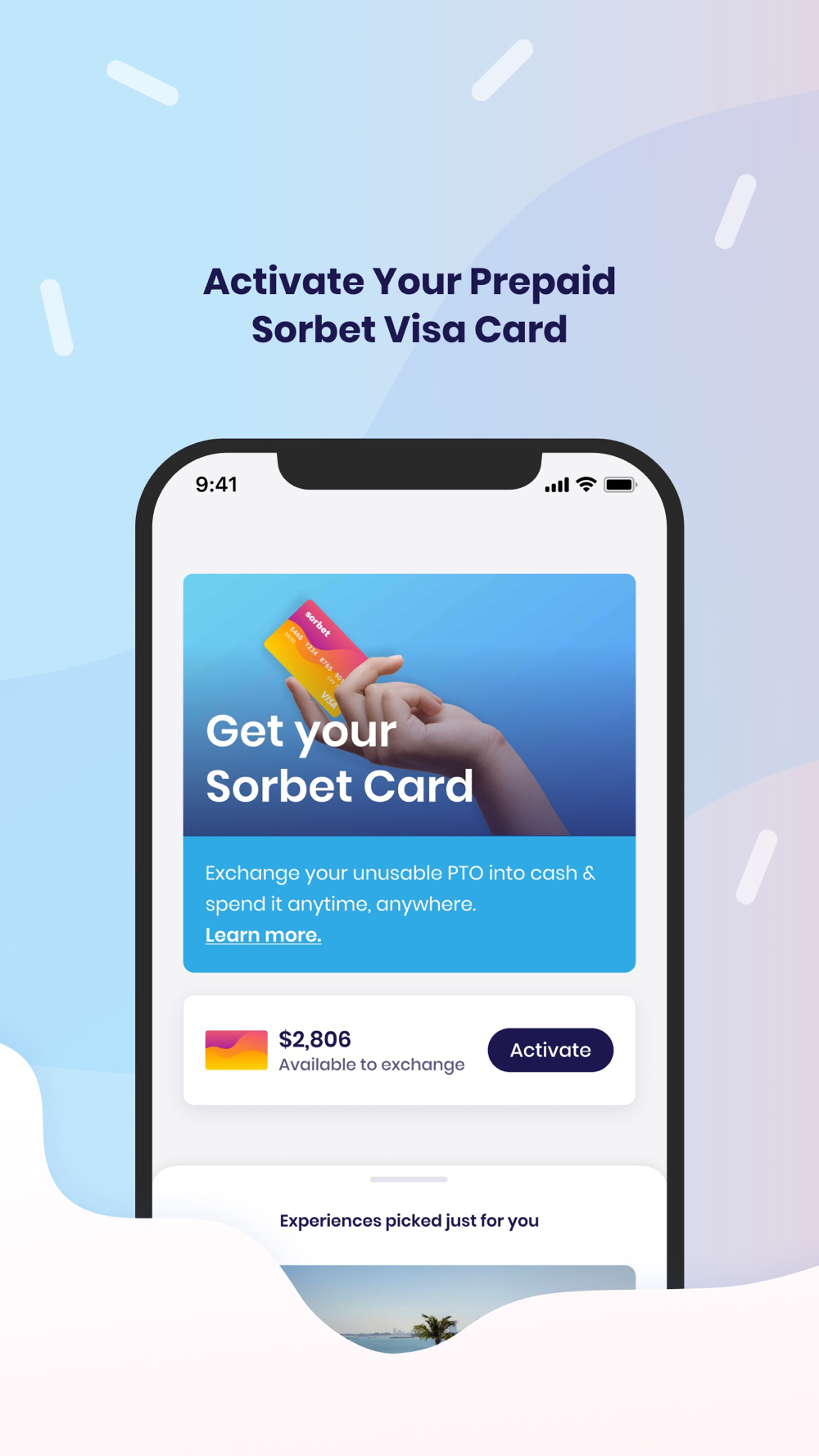 Pay for your next break with your unusable time! Sorbet predicts the portion of your PTO balance which you may never be able to use, and allows you to cash it out immediately (instead of having to wait until you leave the company sometime in the future). Cashed out days are loaded onto a virtual prepaid card which can be used anywhere Visa is accepted.