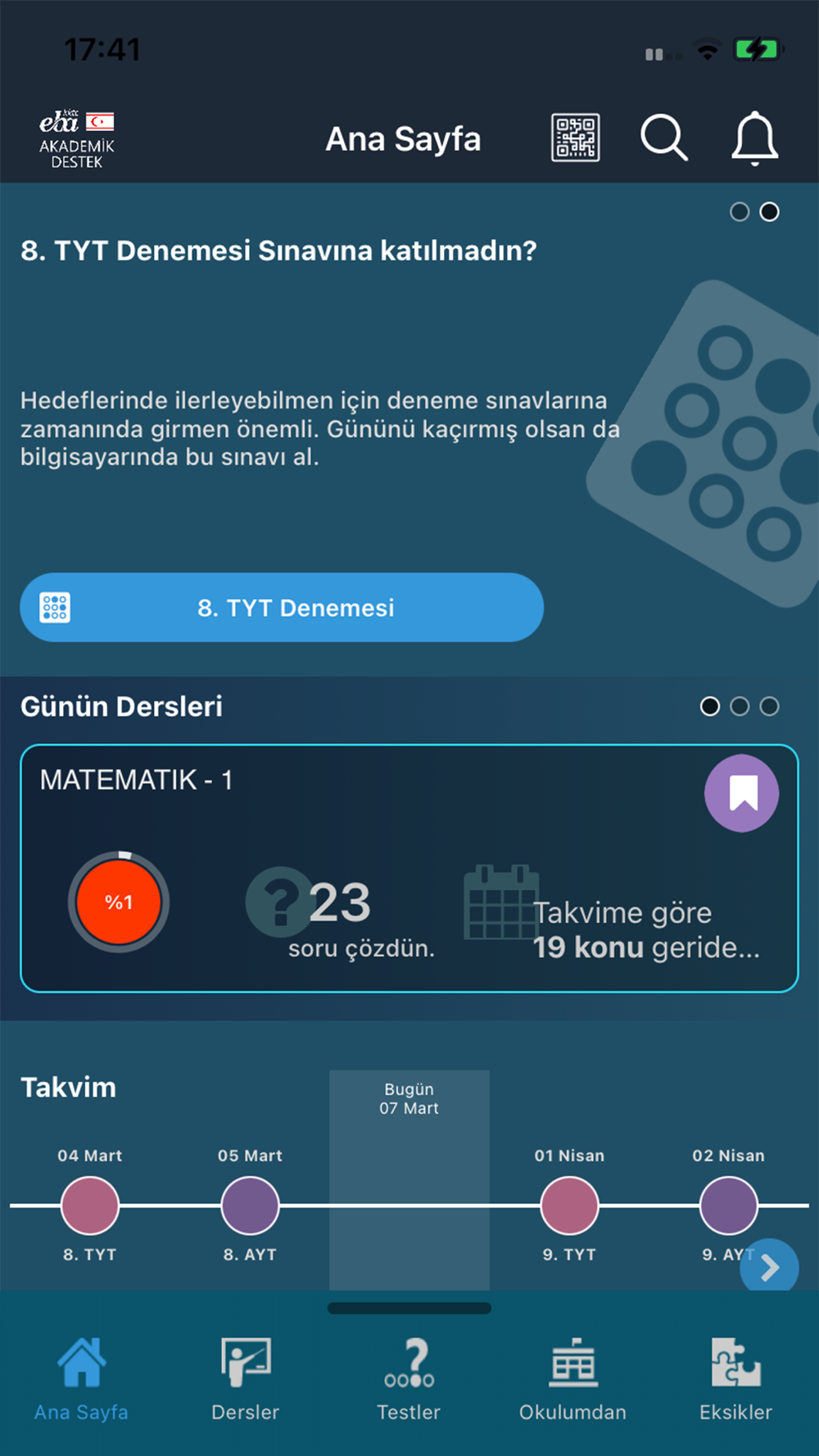 KKTC Akademik Destek’ teki sınav performanslarını detaylarıyla ve kesintisiz takip etmeni, sana özel tekrar listelerine, eksiklerini hızla tamamlayacağın konu anlatım ve soru çözüm videolarına doğrudan ulaşarak zaman kazandırır.