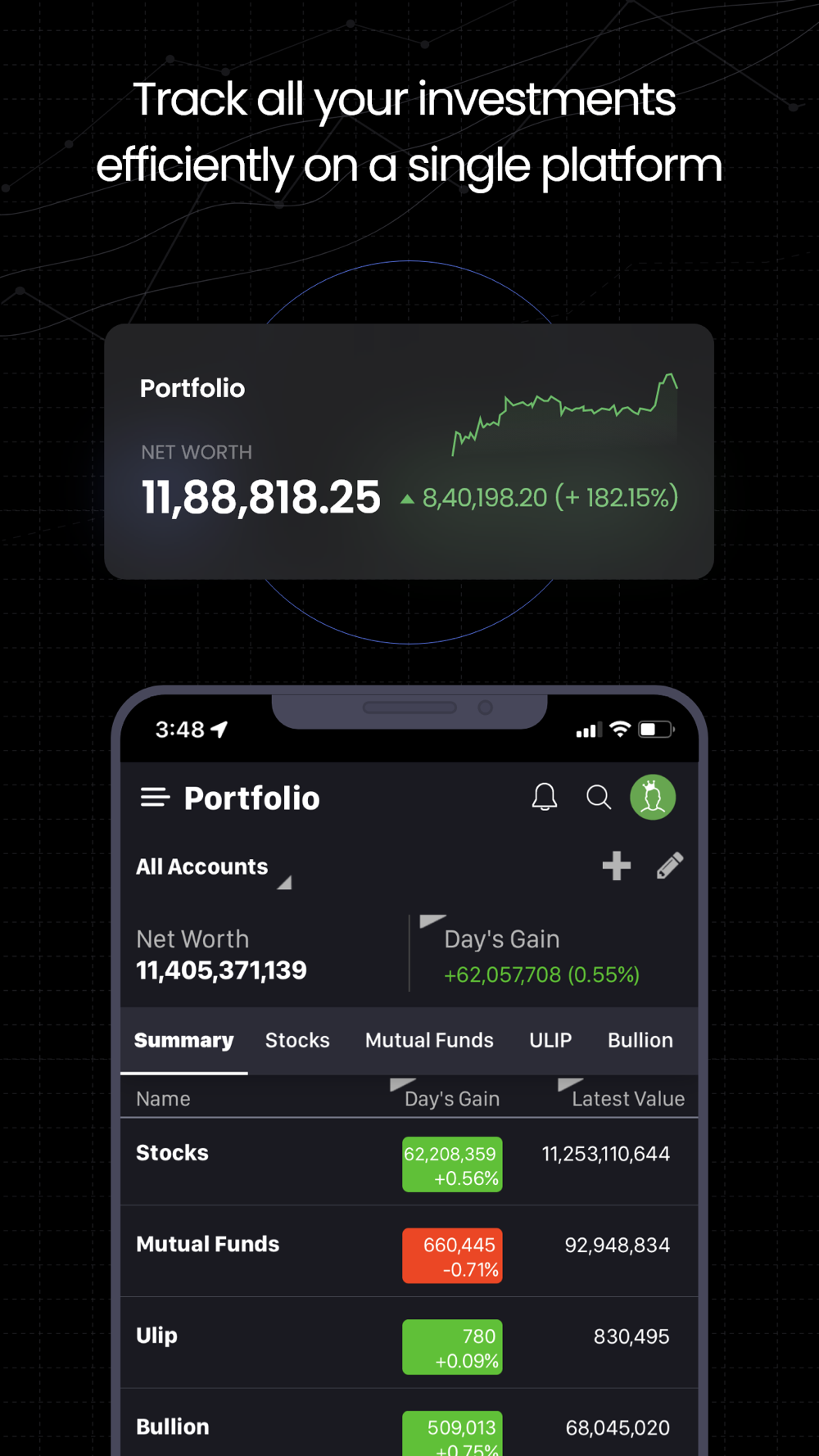 • Monitor your portfolio across Stocks, Mutual Funds, ULIPs, Bullion and other asset classes