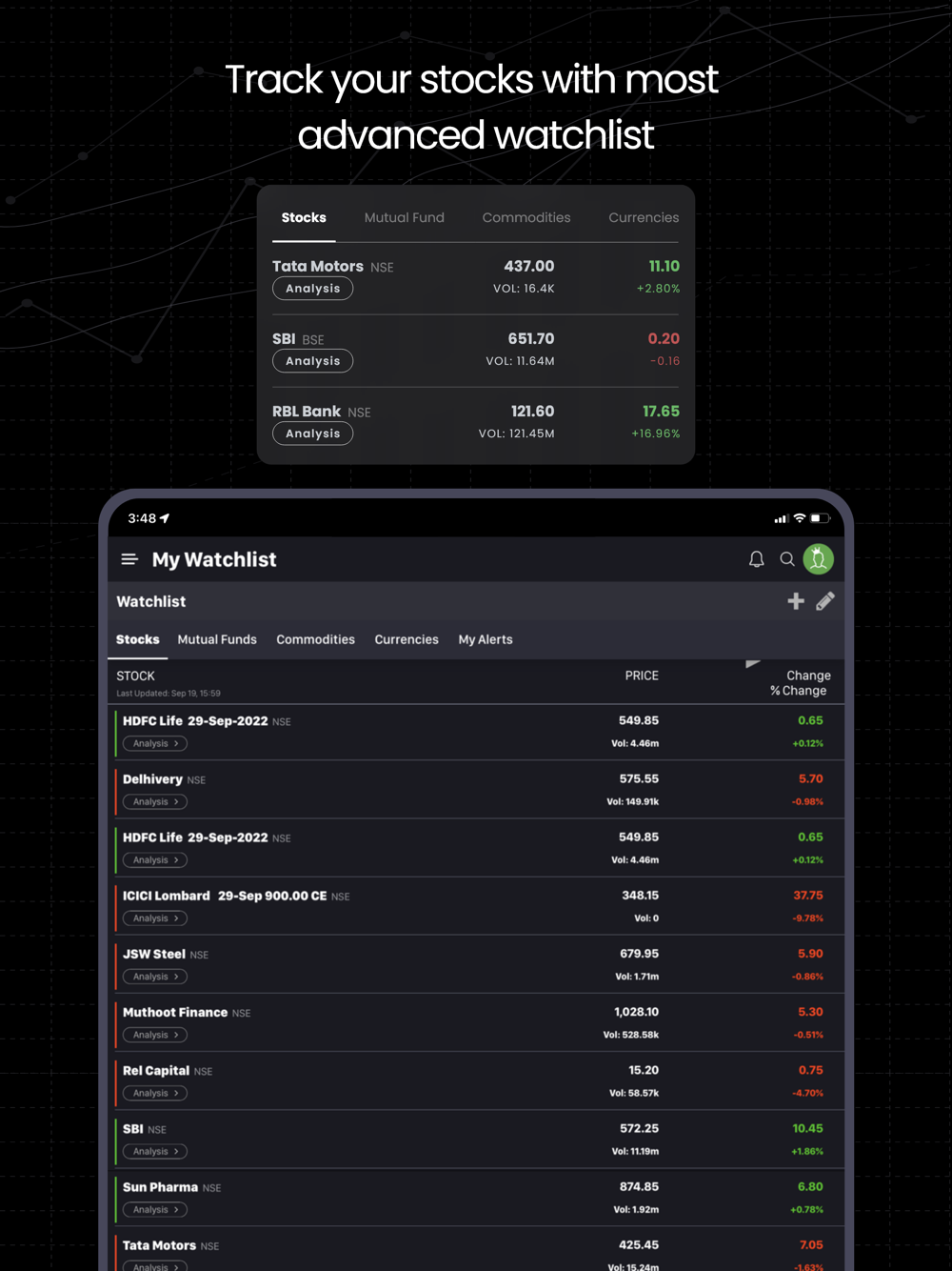 • Track your favourite stocks, mutual funds, commodities, futures and currencies from Watchlist