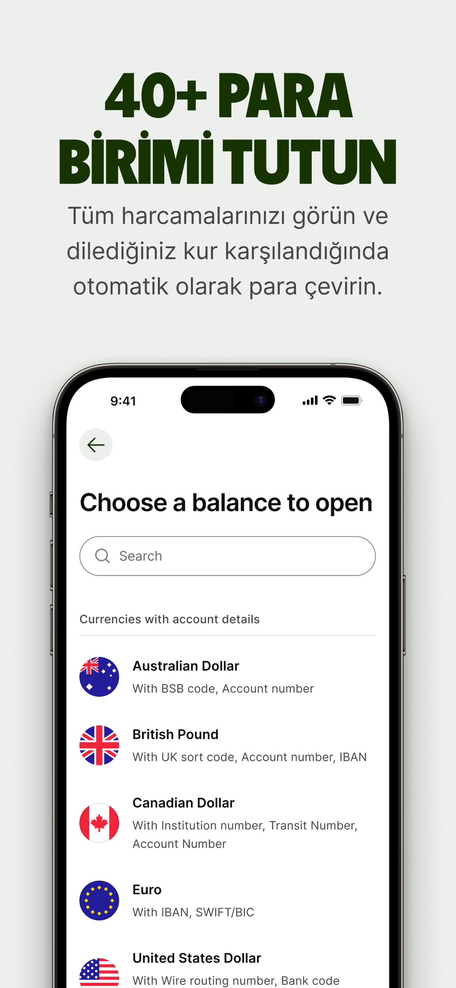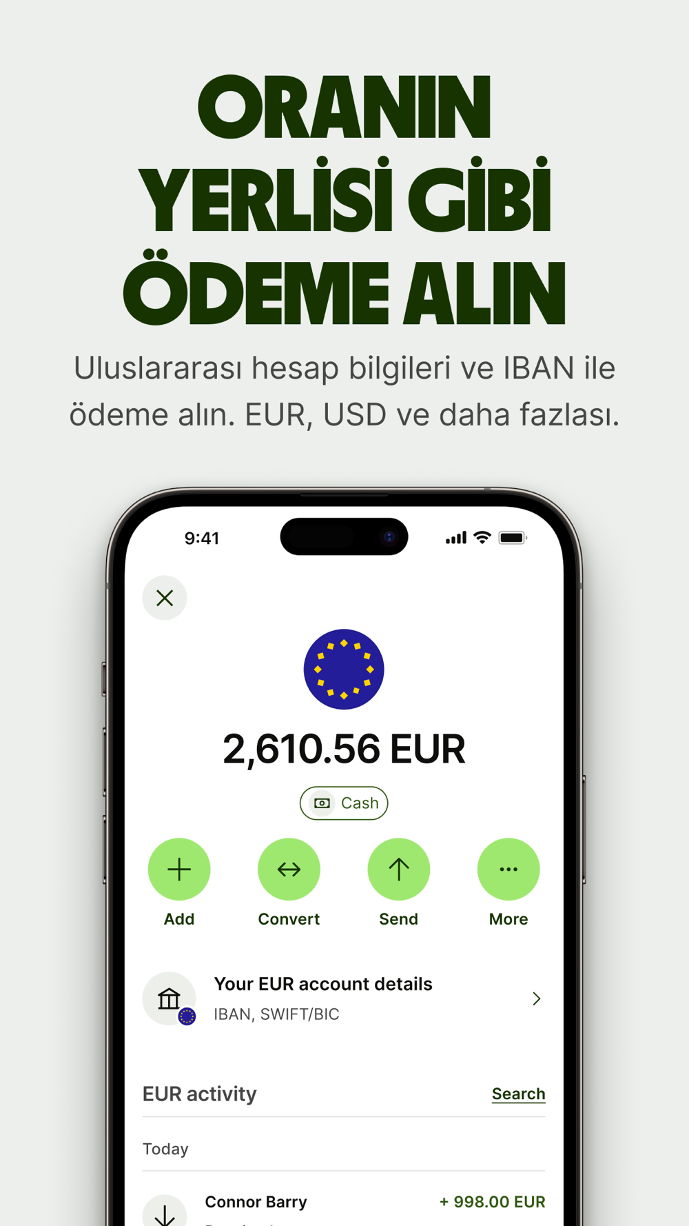 • Birçok para biriminde ücretsiz transfer almak ve doğrudan tahsilat ayarlamak için bu hesap bilgilerini kullanın