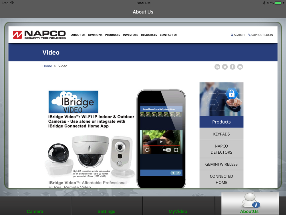 The iSeeVideo application enables the users to watch live video feed on their mobile phones, as captured by their Napco Security Technologies' security camera(s). Pan / Tilt with remote recording commands are also supported.