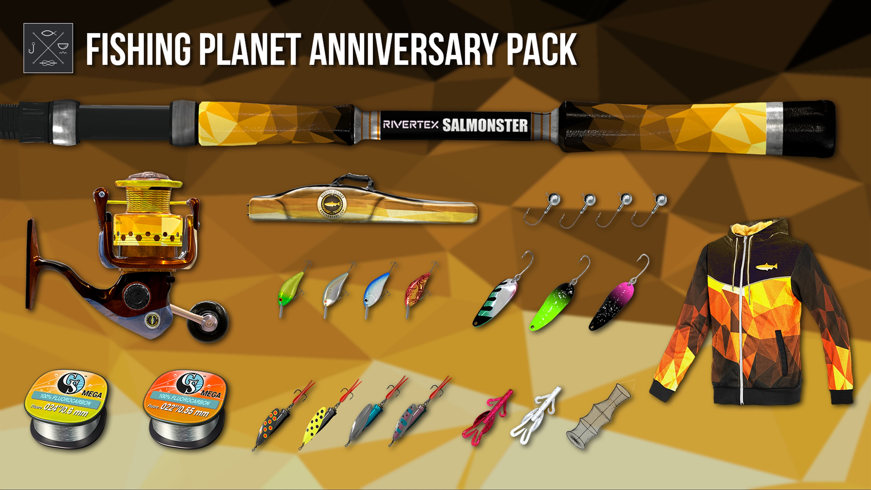 Fishing Planet Anniversary Pack is basically a wonderful bargain combining everything you might need for going after the big bad Salmon in our FP Anniversary Cup. Make sure you’re the number one Salmon catcher with the exclusive super powerful spinning combos of Salmonster™ muscular rods and RedFish™ reels meant to withstand any pressure a Salmon fishing Tournament might bring. Exclusive equipment is available only in this limited edition Pack along with all the spinners, crankbaits, jigheads, and other tackle to help you gain your rightful title of the FPA Cup Champion!