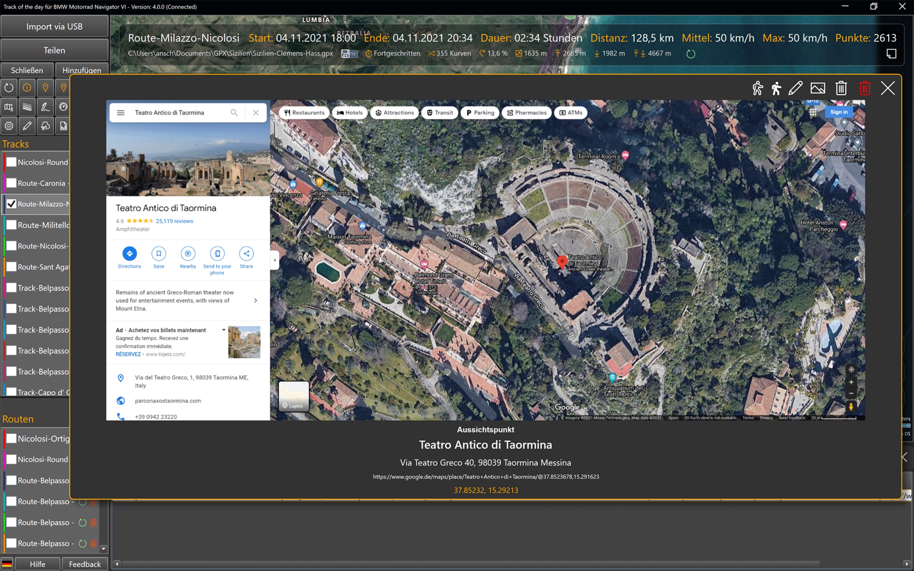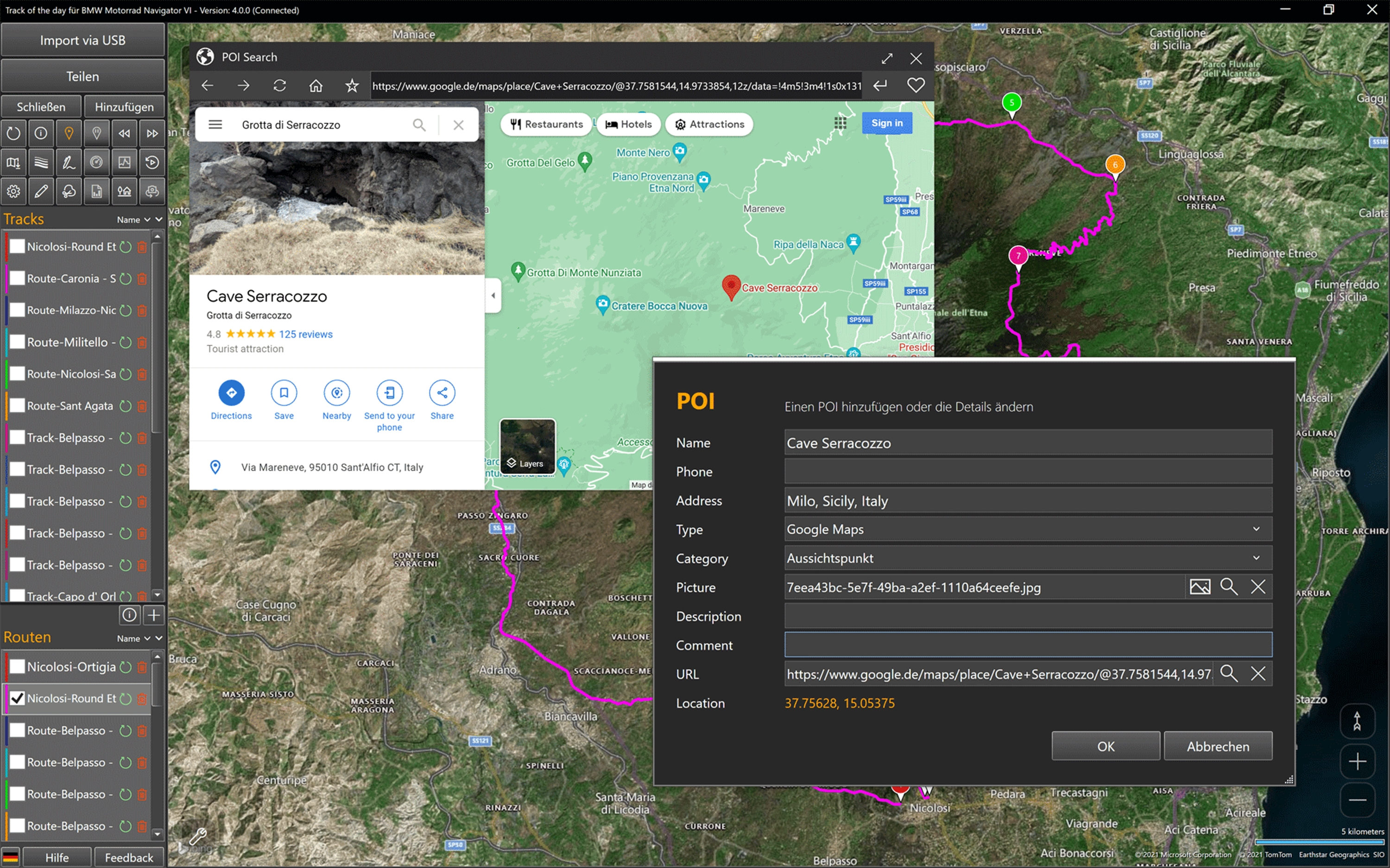 It is possible for anyone to open routes in Google Maps and send them directly to their personal smartphone or tablet. The import of all routes from Google Maps is also supported. Places stored in Google Maps can be imported as POIs at any time.