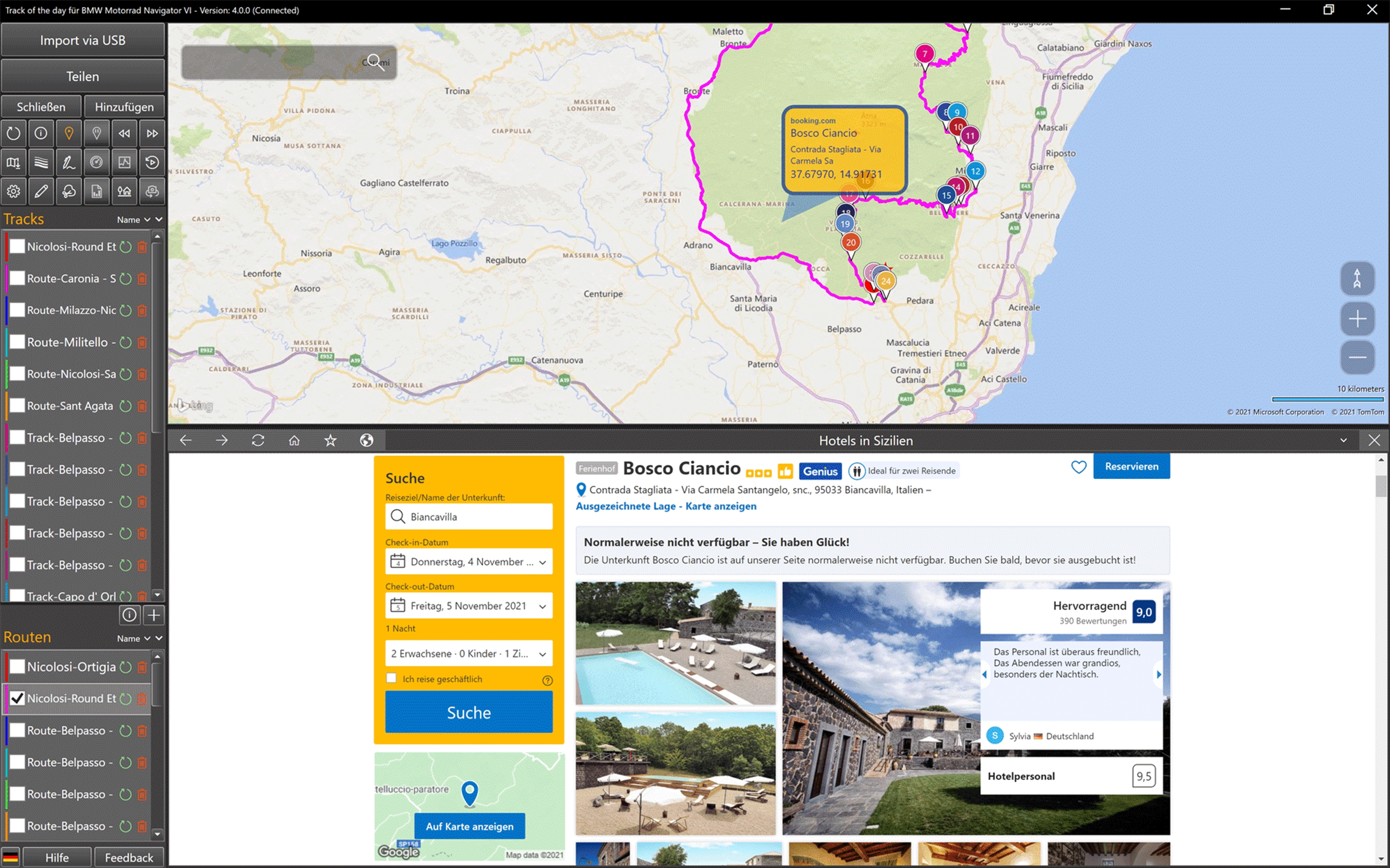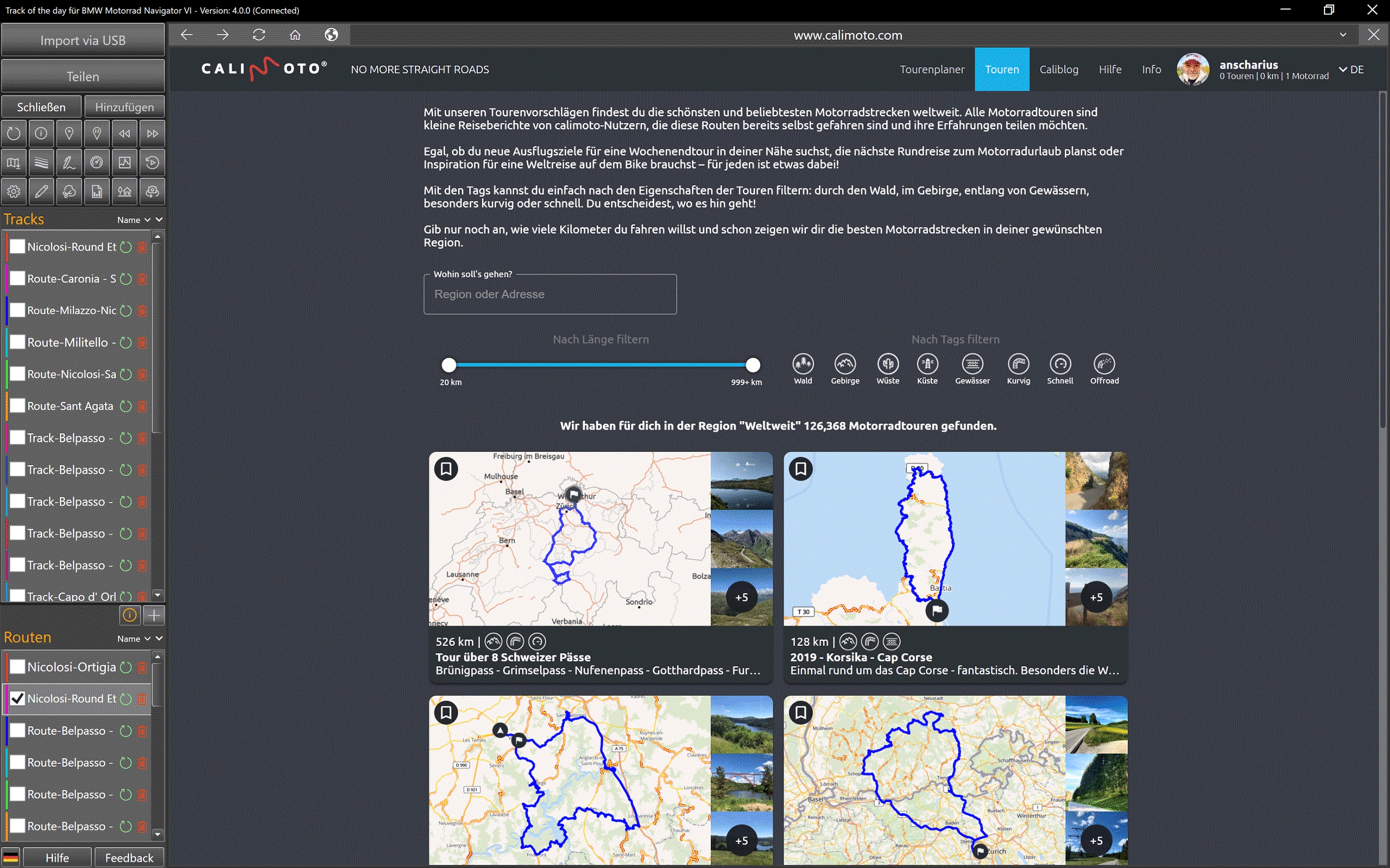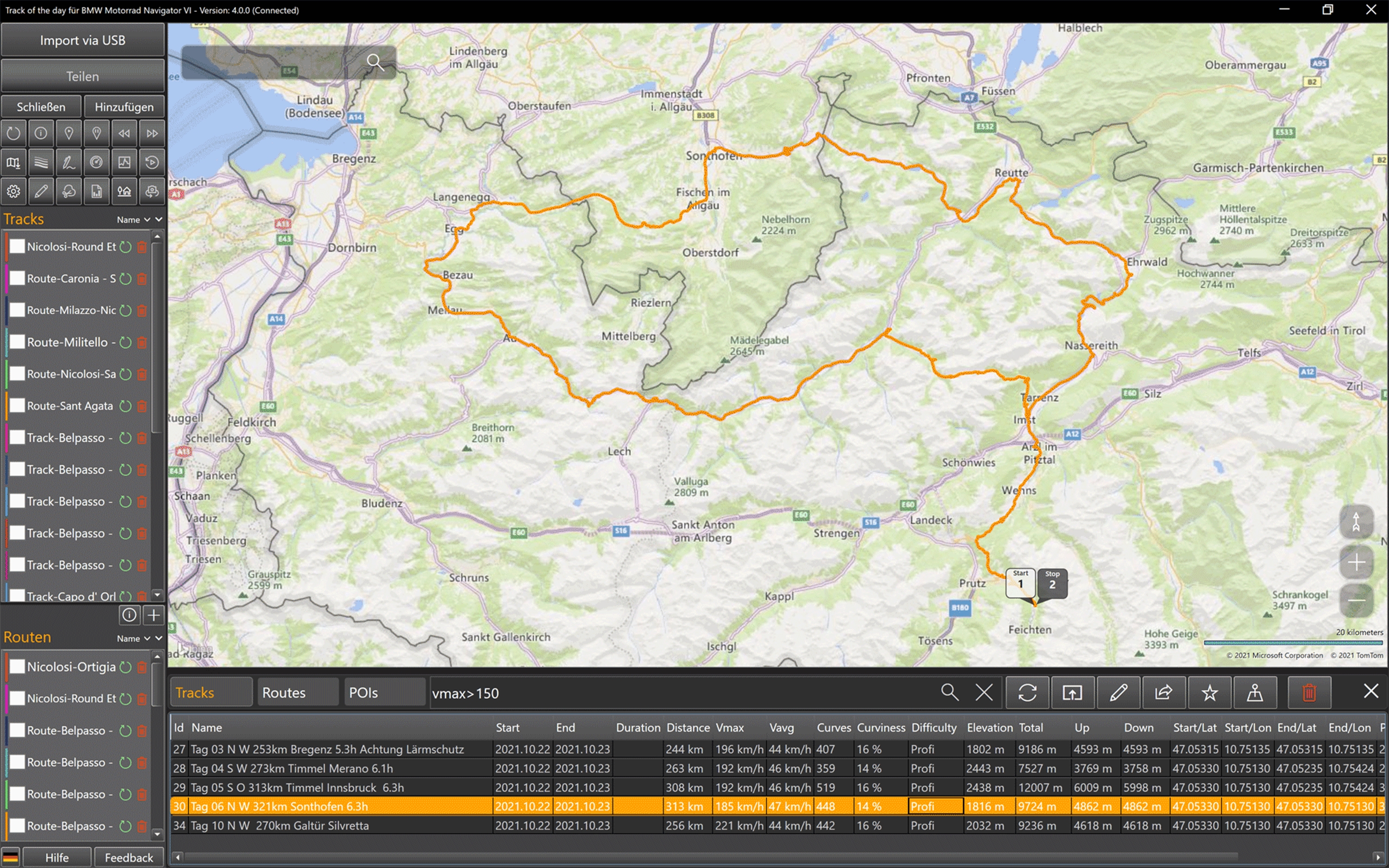 By integrating Komoot, MRA, Calimoto, Kurviger, TomTom MyDrive and many other route planners, ready-made tours can be imported and processed with one click. Plan with Kurviger or Calimoto, navigate with TomTom, Garmin or BMW Navigator, everything is possible. Using Komoot without a subscription with free navigation is also no problem.