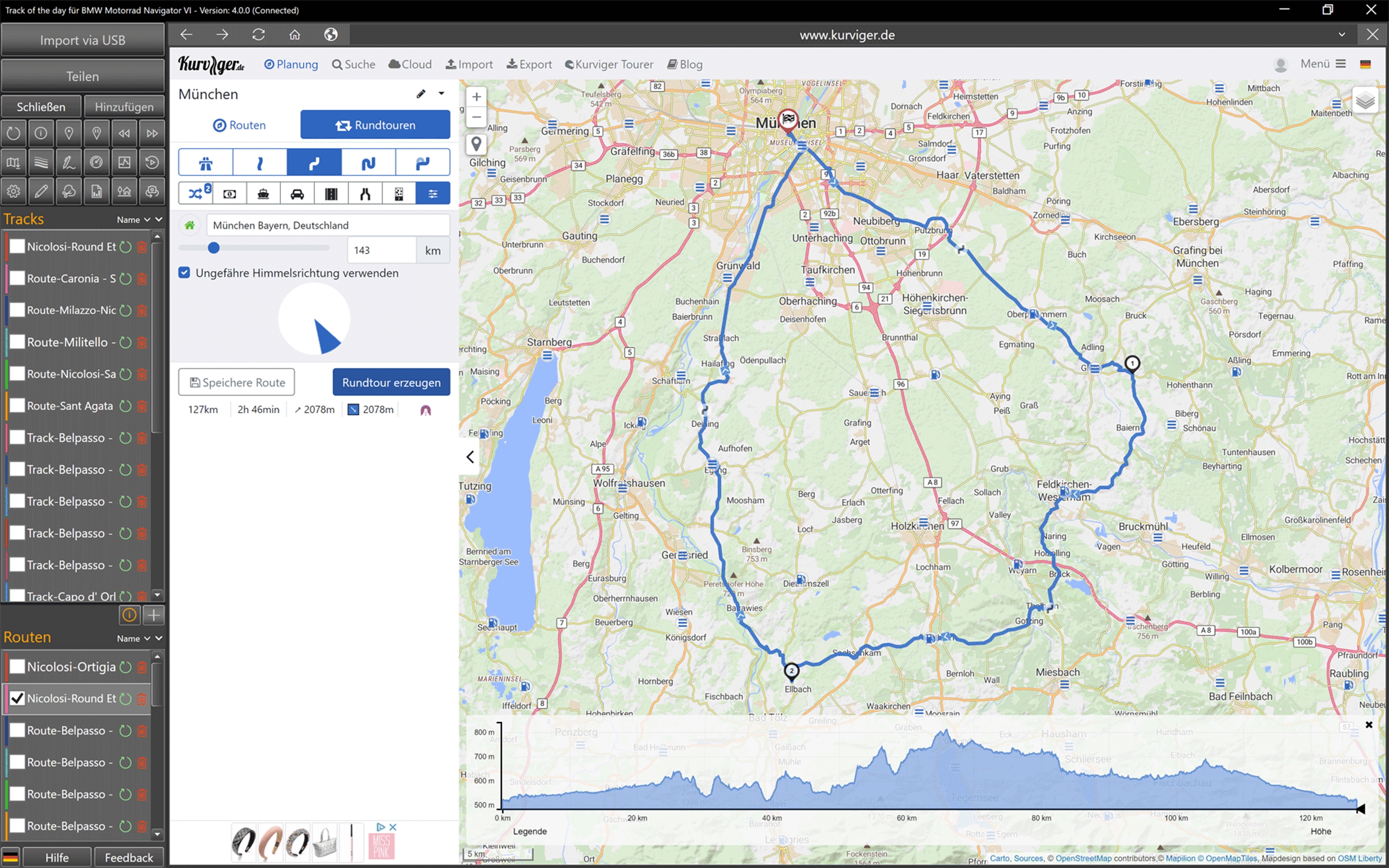 KAKIMOTO is the industrious super curve assistant that automatically creates new variants for breathtaking motorcycle routes for motorcycle enthusiasts. Round trips can be easily created on the basis of the current map section. Entry and return can be freely specified for all round trips at any time.