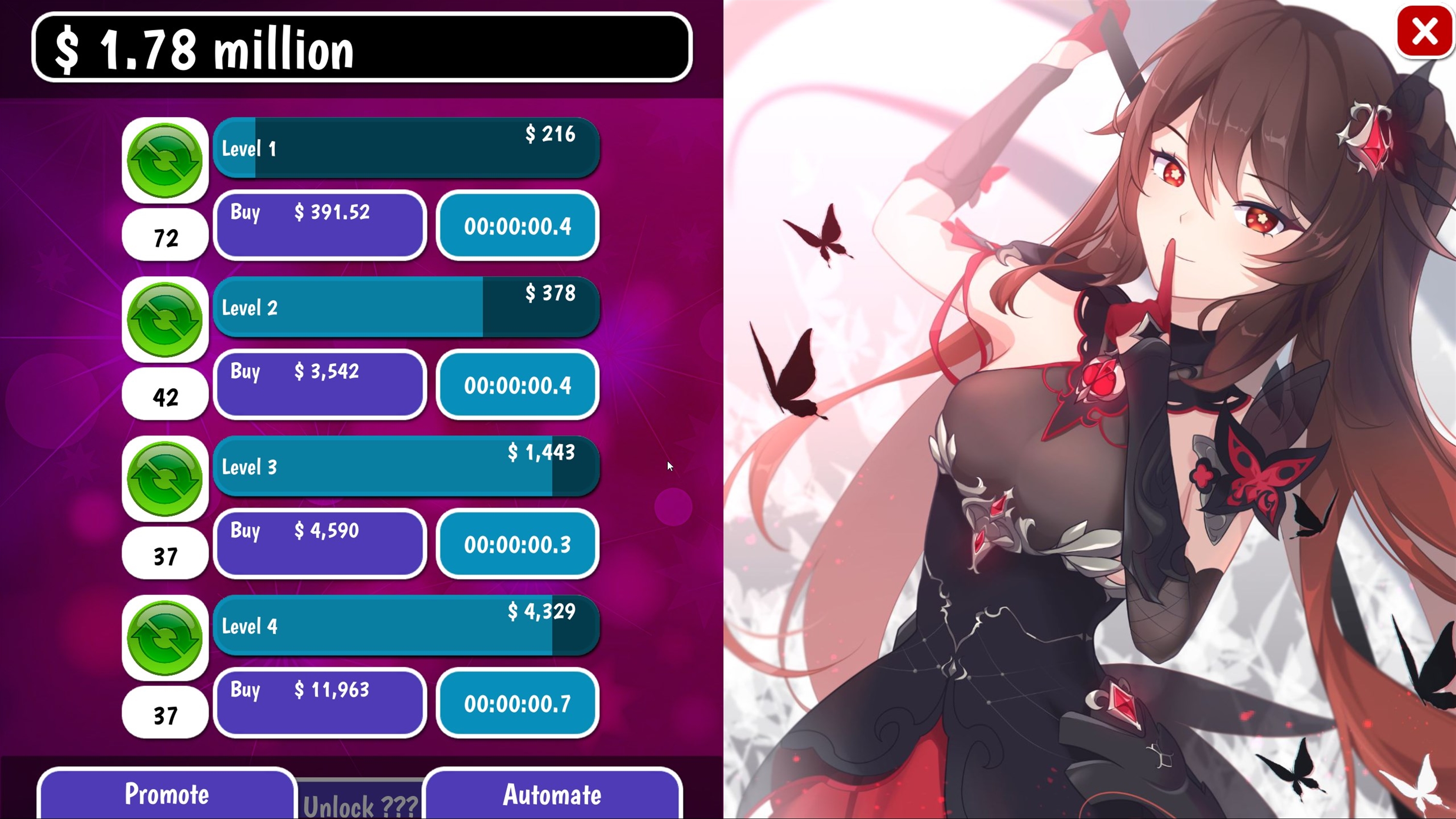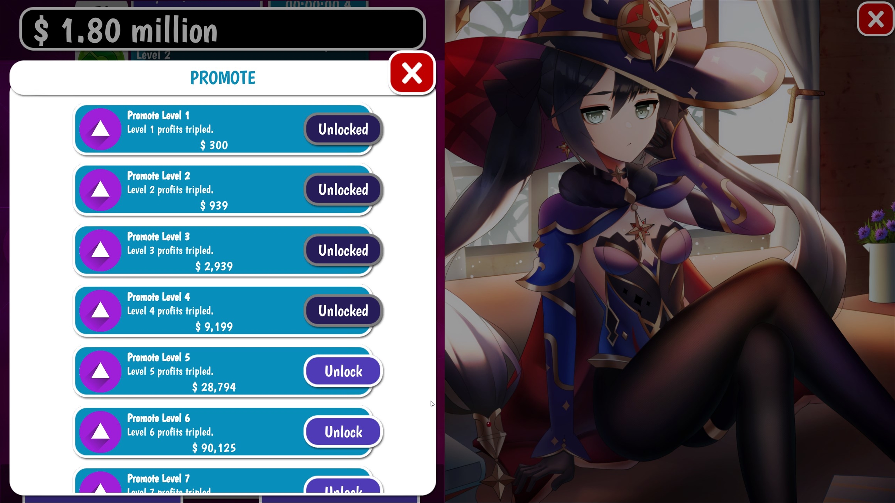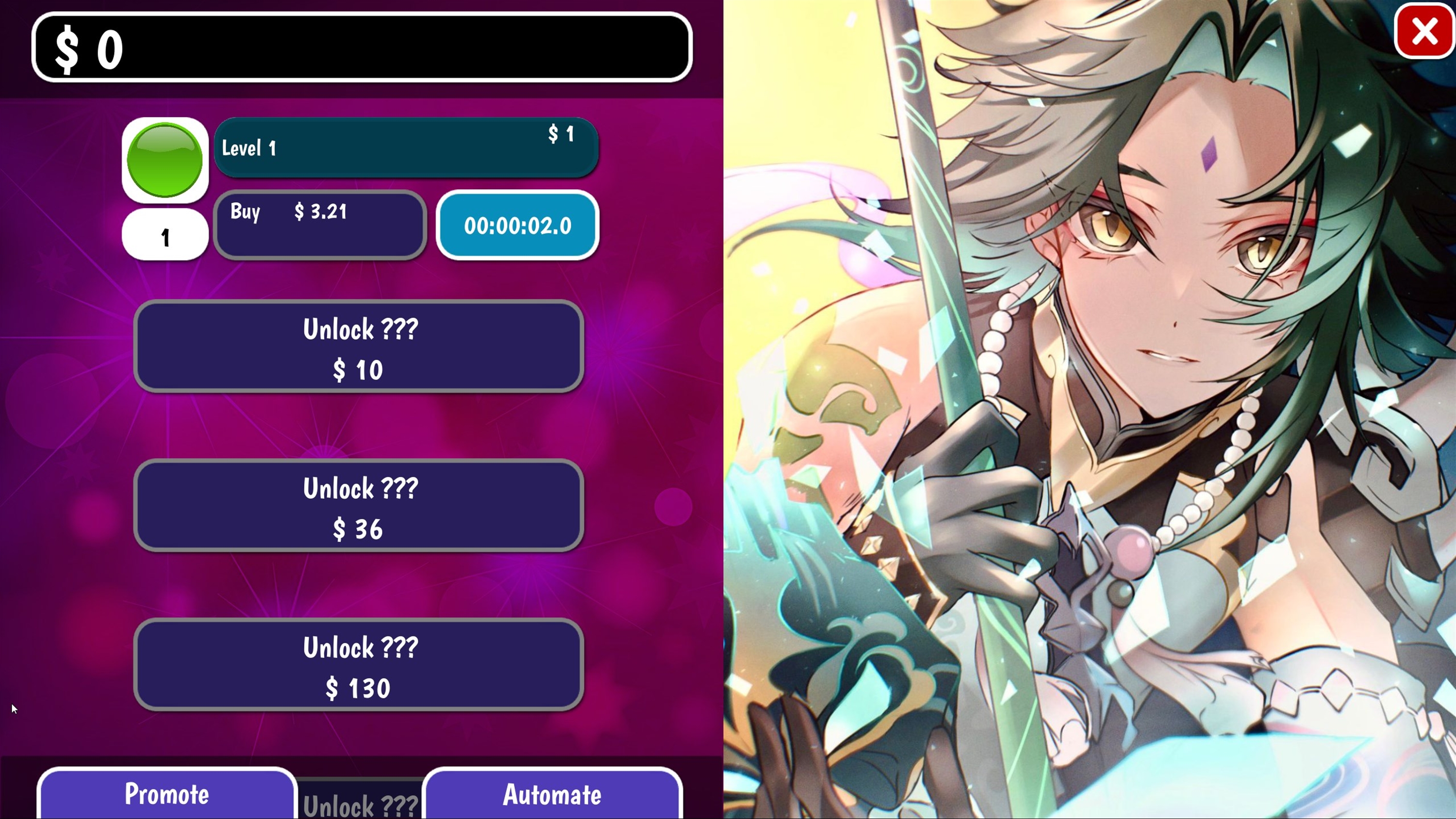 Welcome to the world of NAME! Watch as your tiny empire grows into a massive money-making machine. Unlock new levels, buy promotions, enable automation and watch your earnings explode. Each level comes with increased income, upgrades, and amazing artwork. Plan your purchases strategically to fit your play style. Like to play passively over weeks/months? Stack automation upgrades. Prefer to actively play? Purchases cutting-edge upgrades to earn the most per second!