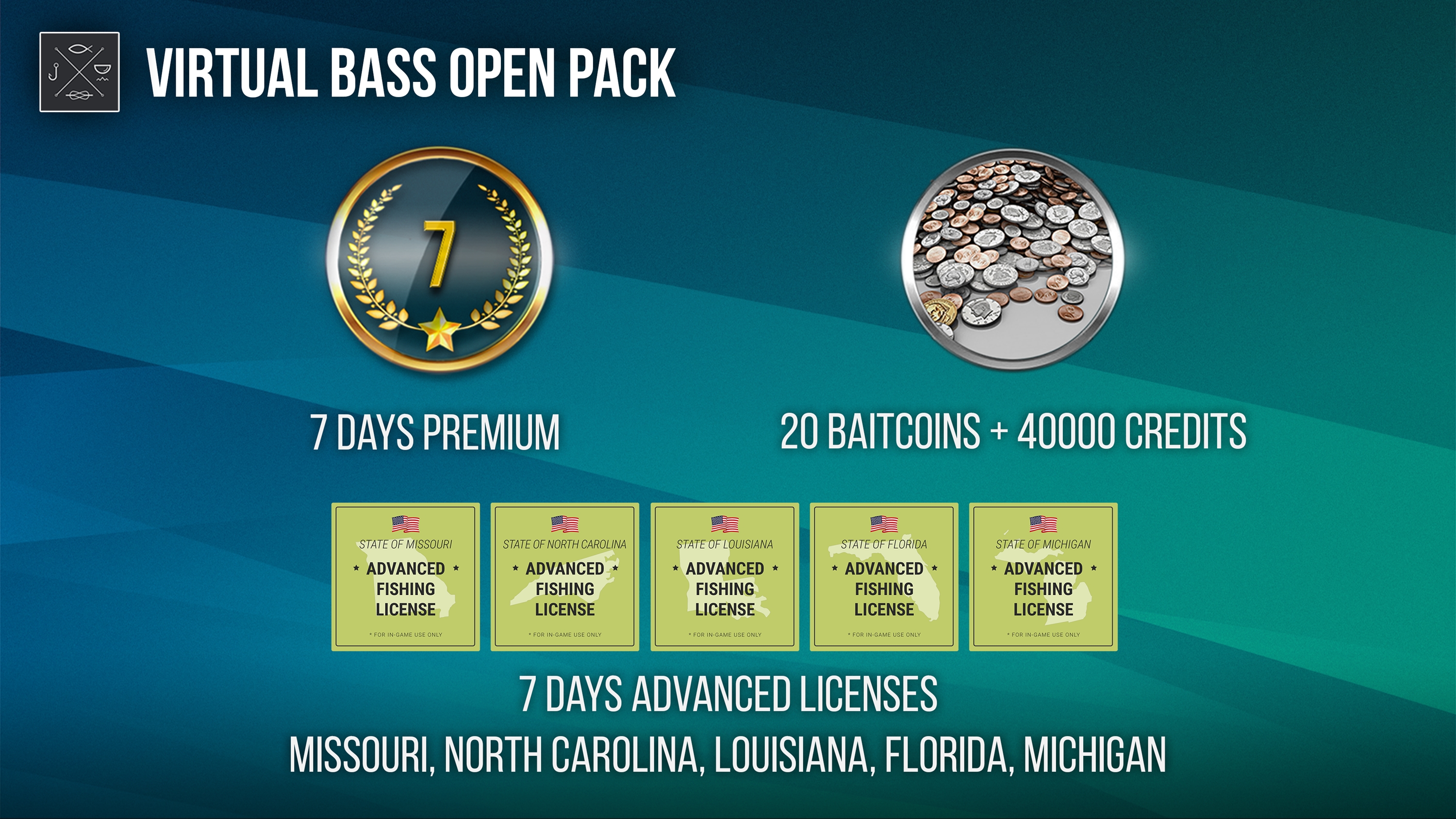 * 20 BAITCOINS - use to purchase certain fishing tackle, available only for BaitCoins. Spend your BaitCoins wisely!