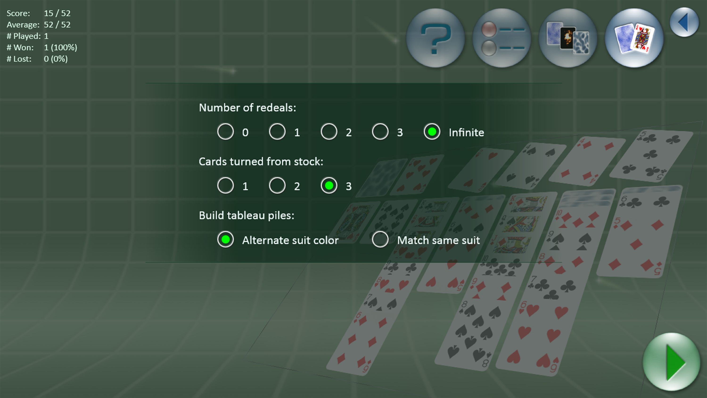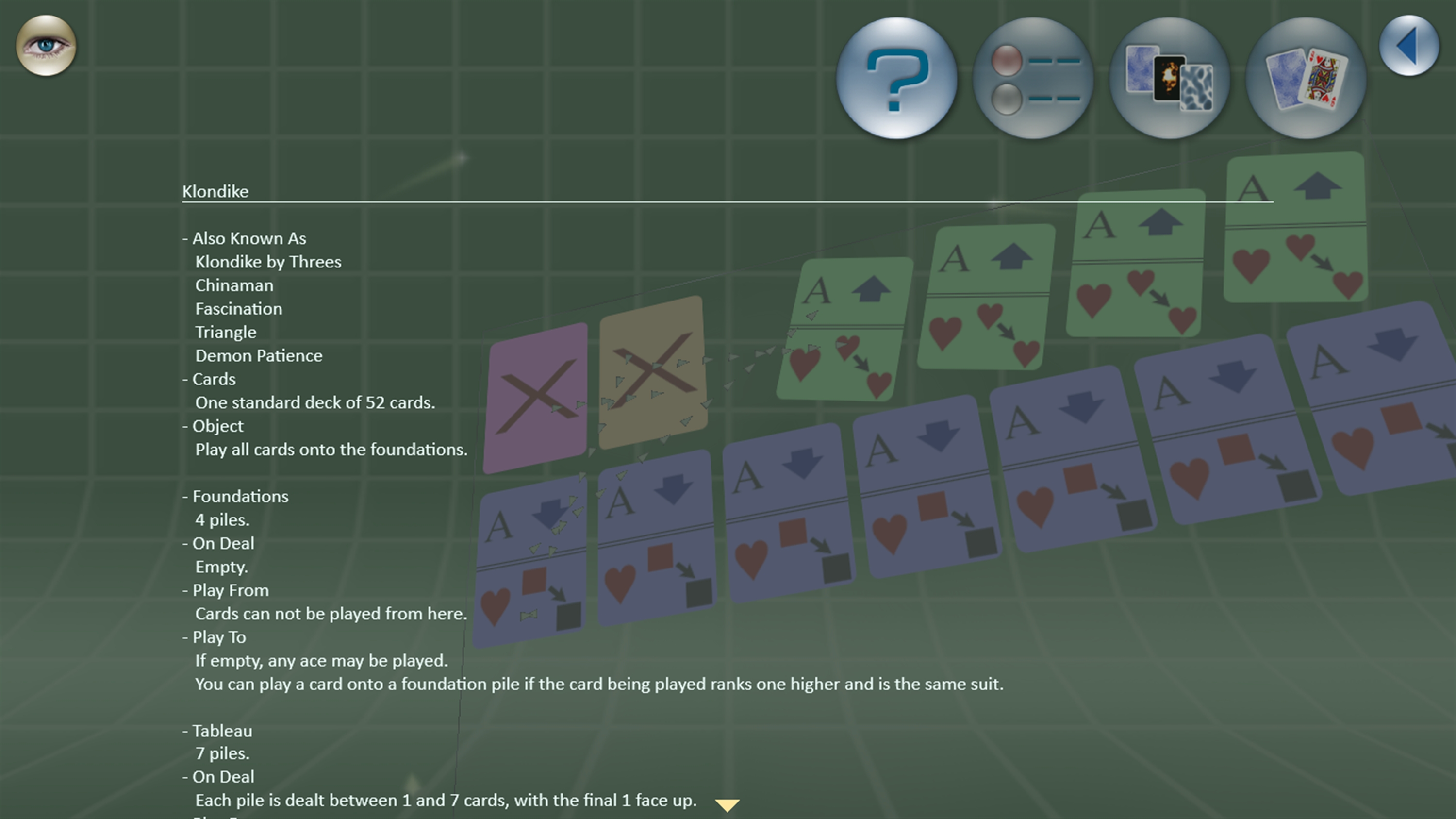 Enjoy everyone's favorite solitaire game, Klondike. Rich graphics and smooth animation enhance your game-play experience in 3D.