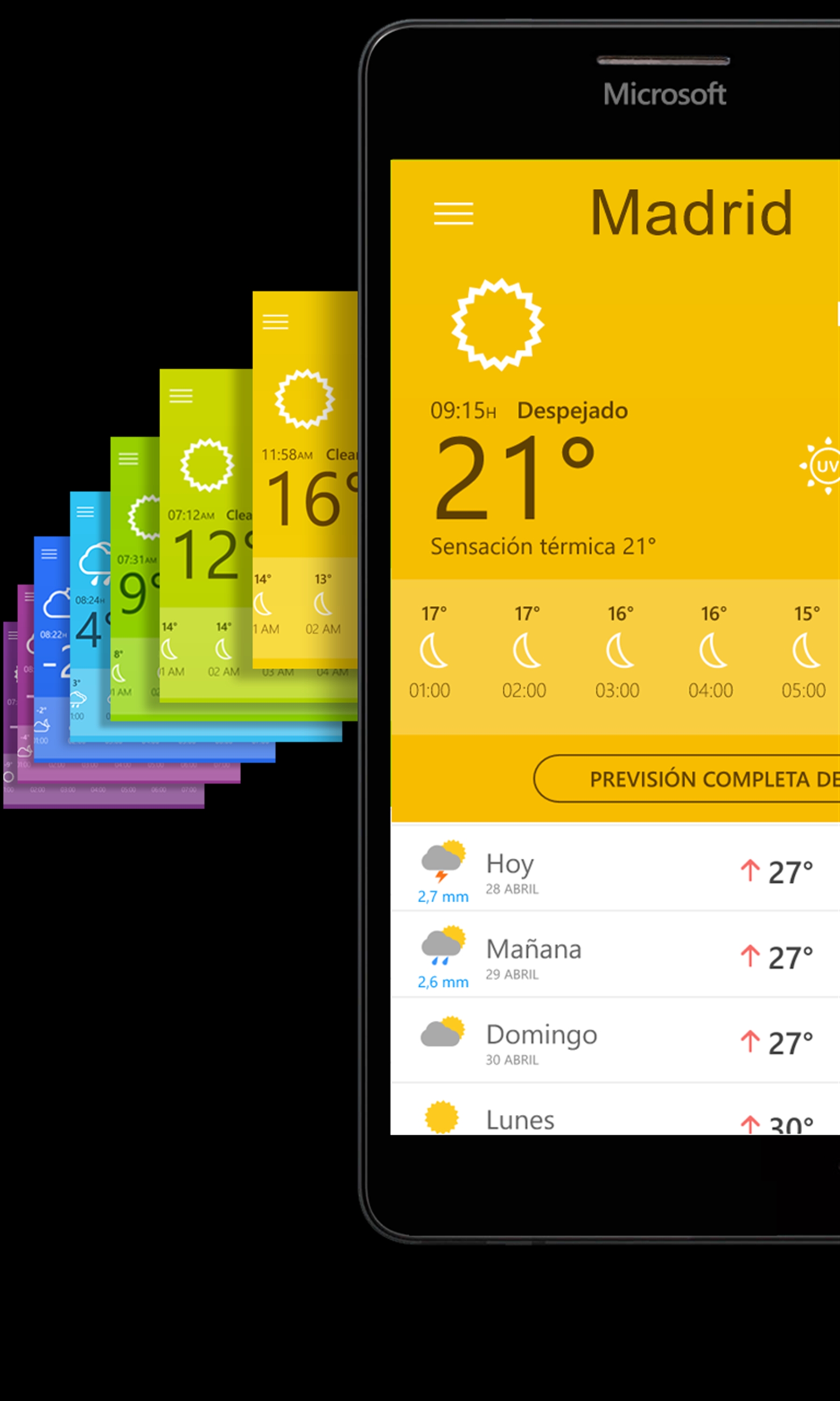- Personaliza tu smartphone por medio de nuestros Live Tiles o widgets, coloca la temperatura en el escritorio o inicio y visualiza los datos en diferentes formatos internacionales como por ejemplo grados celsius, fahrenheit o kelvin.
