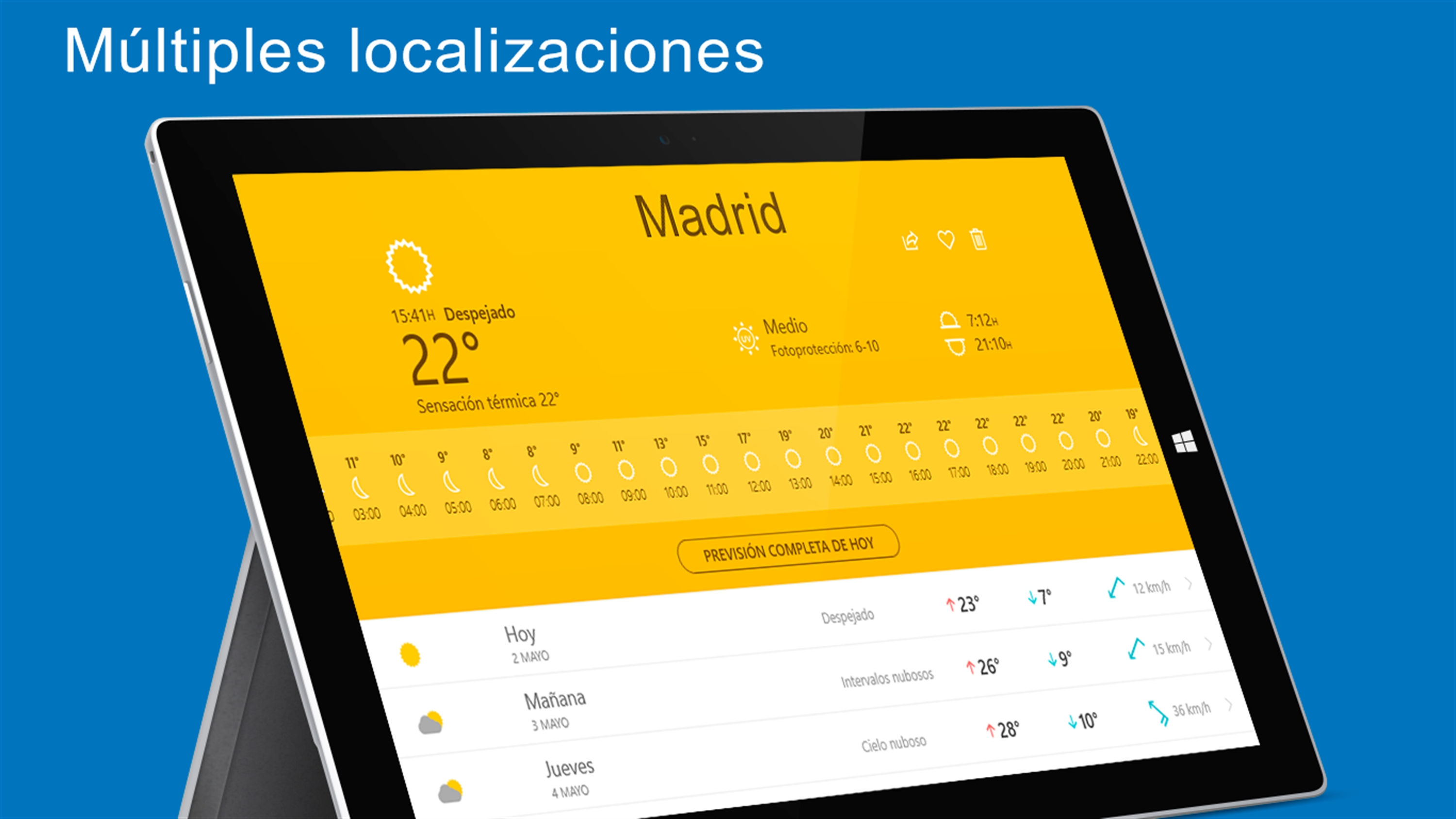 El Tiempo 14 días es la aplicación líder desarrollada íntegramente en España con más de 12 millones de descargas, totalmente GRATUITA e información meteorológica para España y el resto del mundo. Compatible con cualquier teléfono o tablet de cualquier versión de Microsoft Windows. App oficial de Tiempo.com, preferida por los aficionados a la meteorología, con previsiones meteorológicas propias y más de 15 años de experiencia. Cuenta con un diseño moderno basado en Material Design para que consultar el tiempo sea rápido y sencillo.