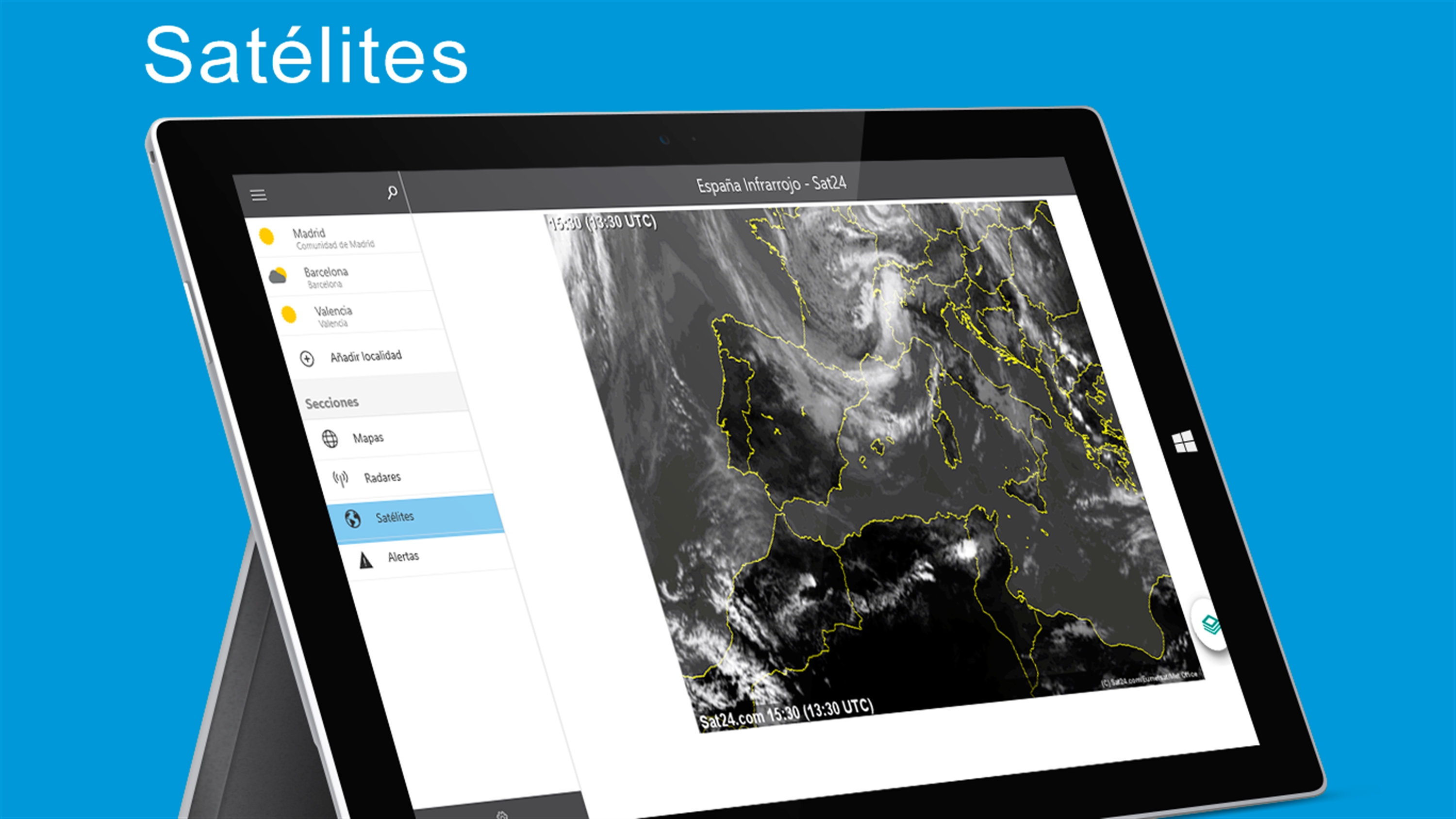 - Visualiza imágenes de satélite visible, infrarrojos y de vapor de agua.