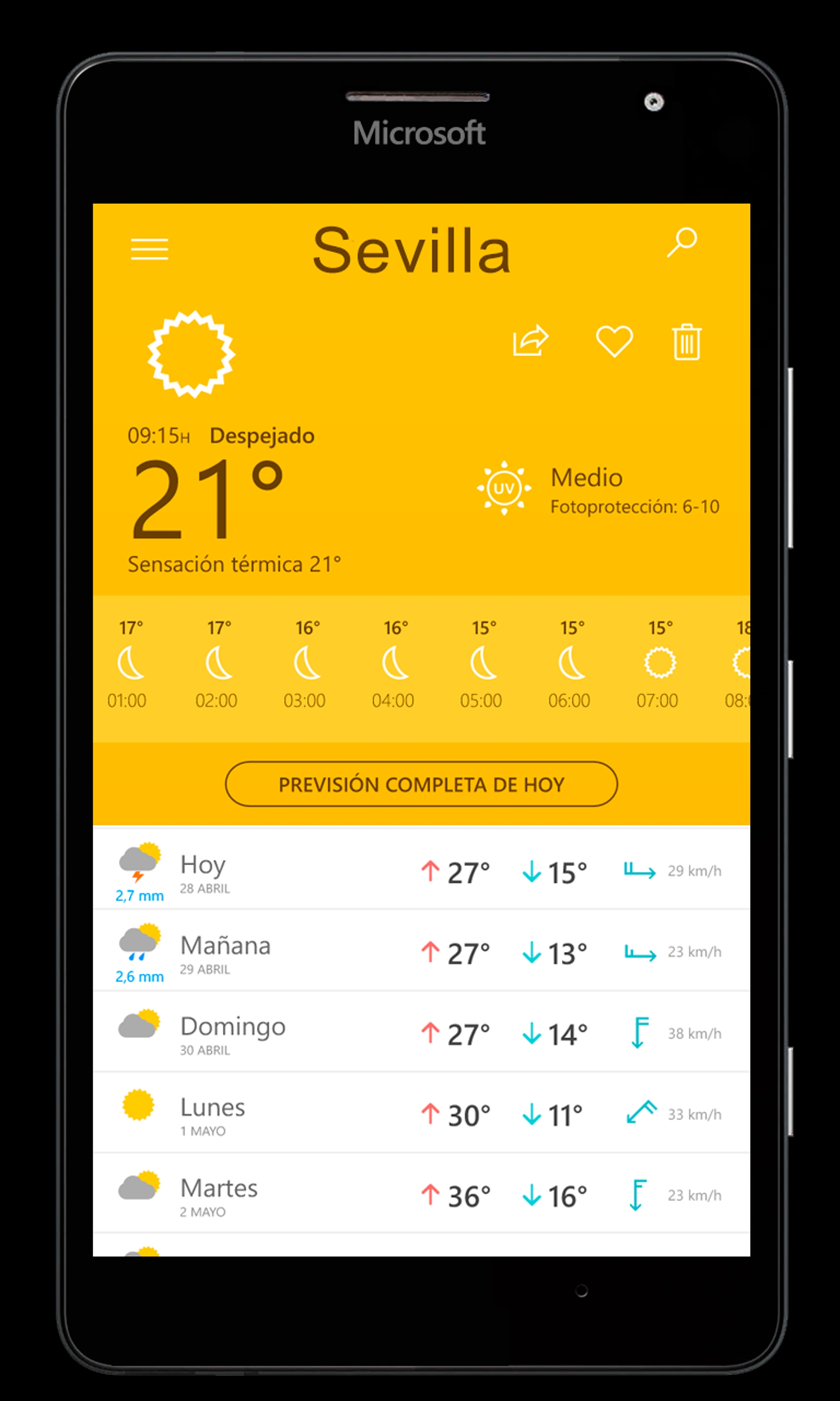 - En la pantalla de predicción diaria verás el tiempo actual y los principales datos de los próximos 14 días. Navega por tus localidades con un simple deslizamiento con el dedo… y recuerda! la aplicación cambia de color automáticamente con la temperatura.