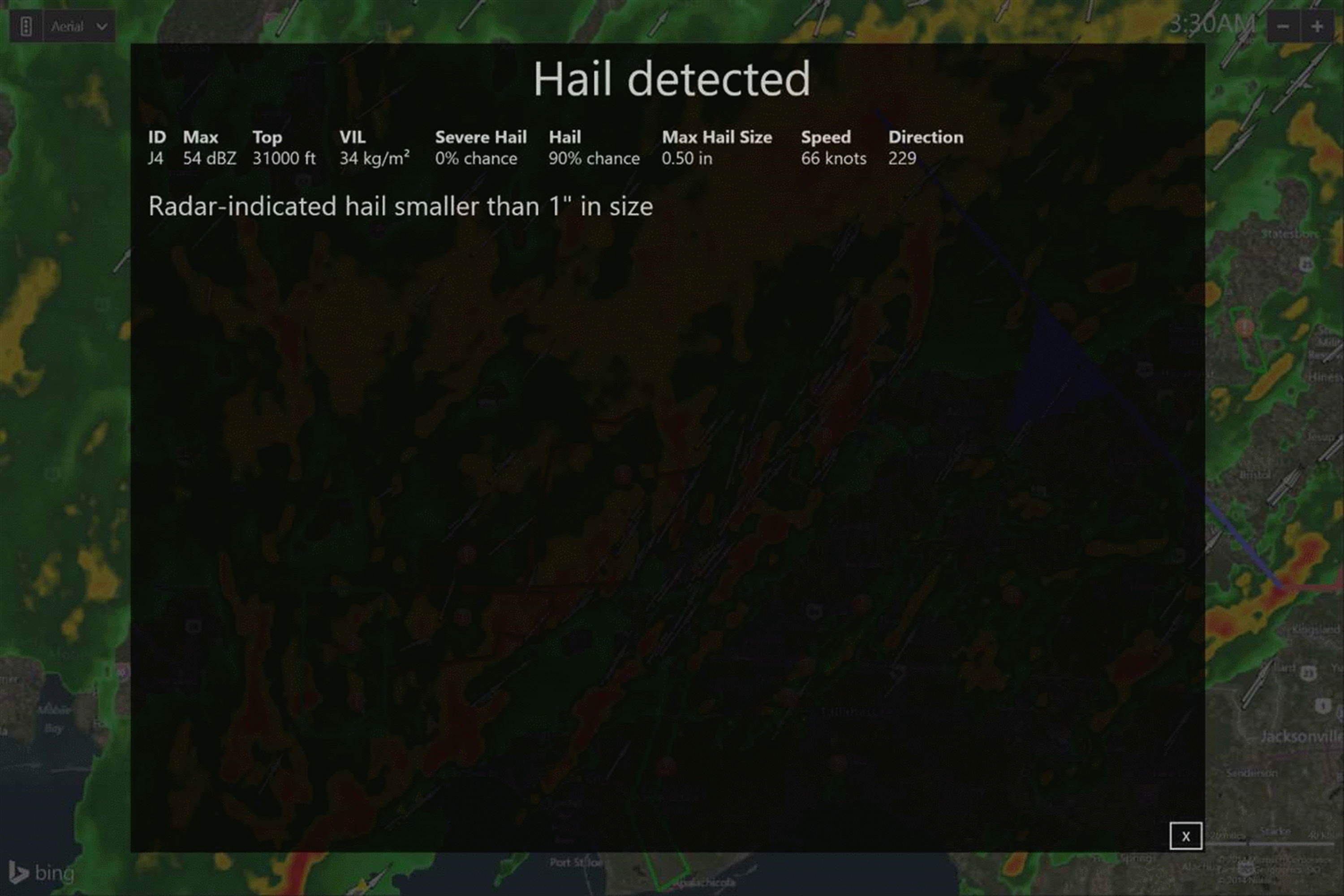 Haga clic en íconos de granizo, mesociclón o televisores para ver la tabla de atributos de la tormenta para esa celda de tormenta en particular. La tabla de atributos de tormenta incluye información sobre el tamaño del granizo, la probabilidad de granizo, la altura de la cima de la nube, el líquido integrado verticalmente y más.
