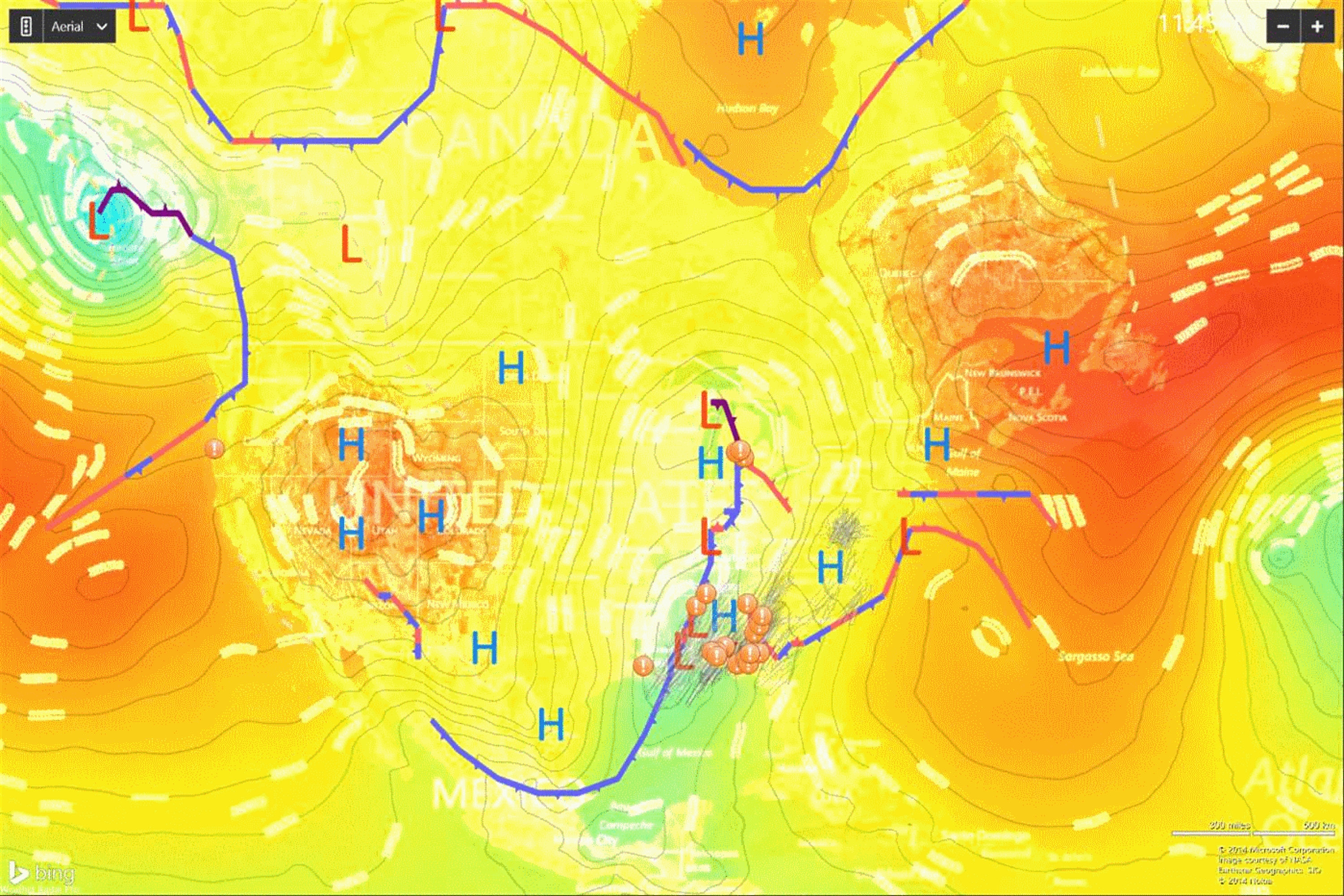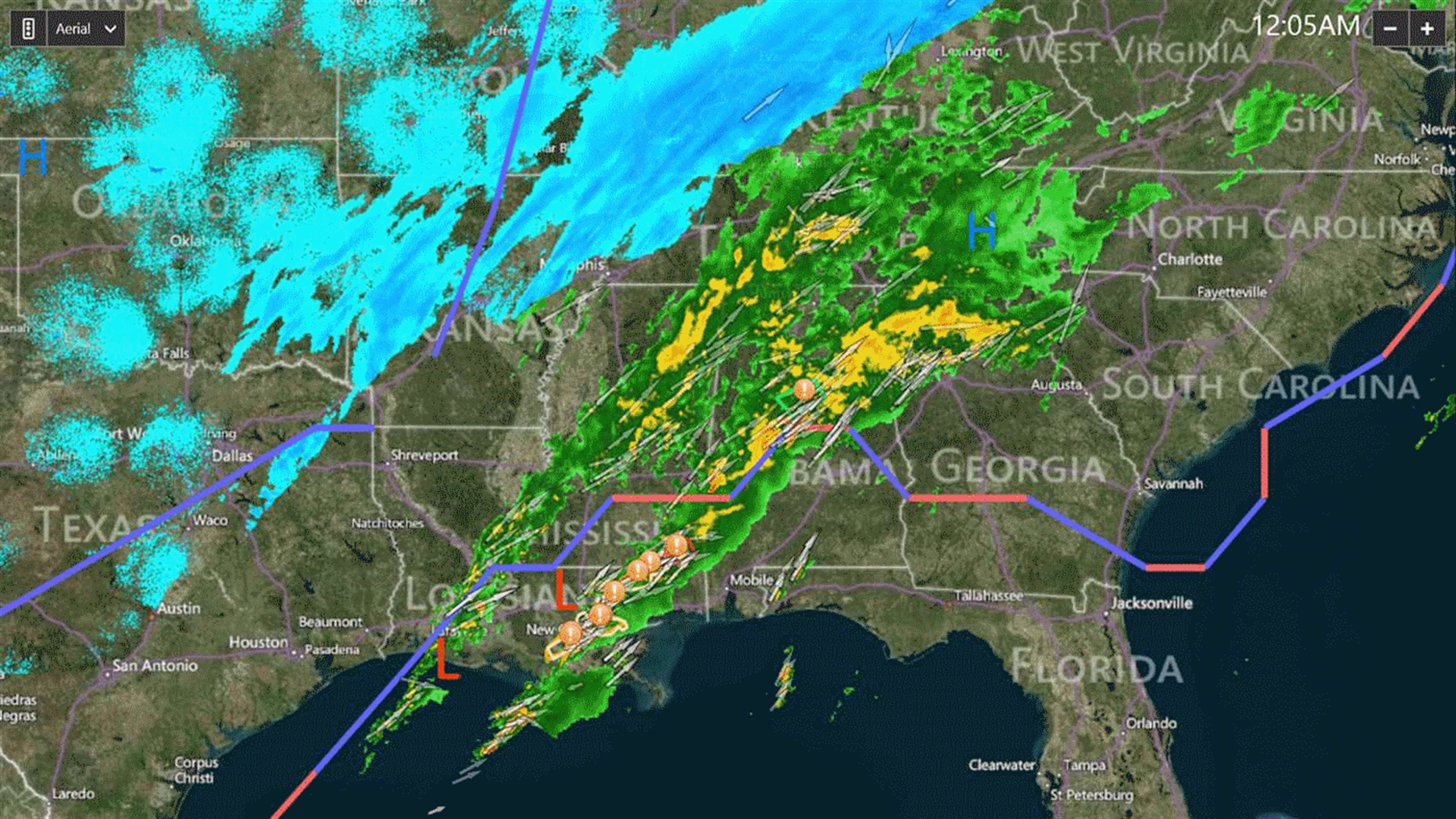 Superposición de radar animado sobre imágenes de satélite GOES, visualización de datos de temperatura global o visualización de la presión global del nivel del mar con isobaras. Las imágenes de radar cubren los Estados Unidos, Europa, Guam y el Caribe Oriental. Los datos de huracanes son globales e incluyen todos los océanos del mundo.