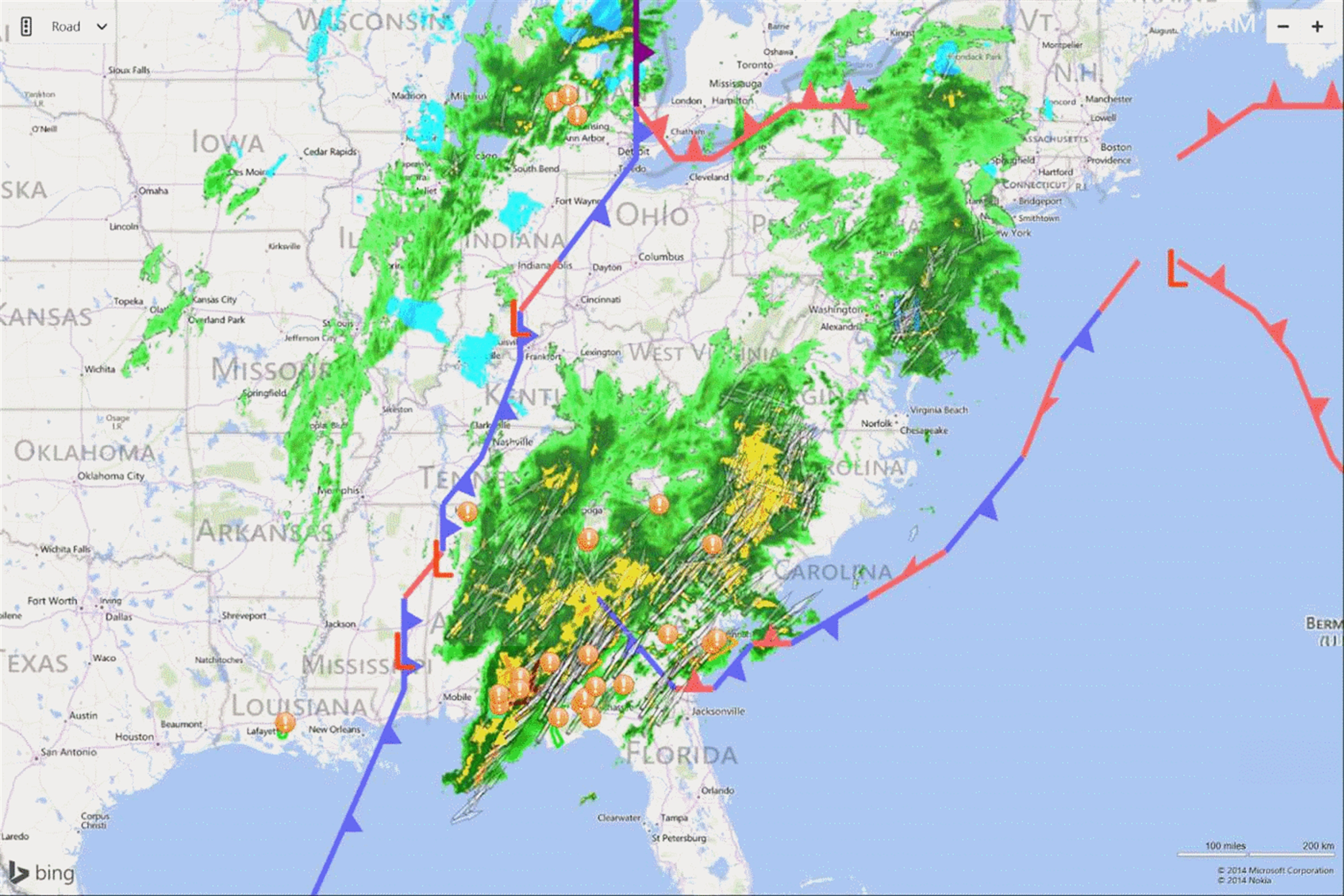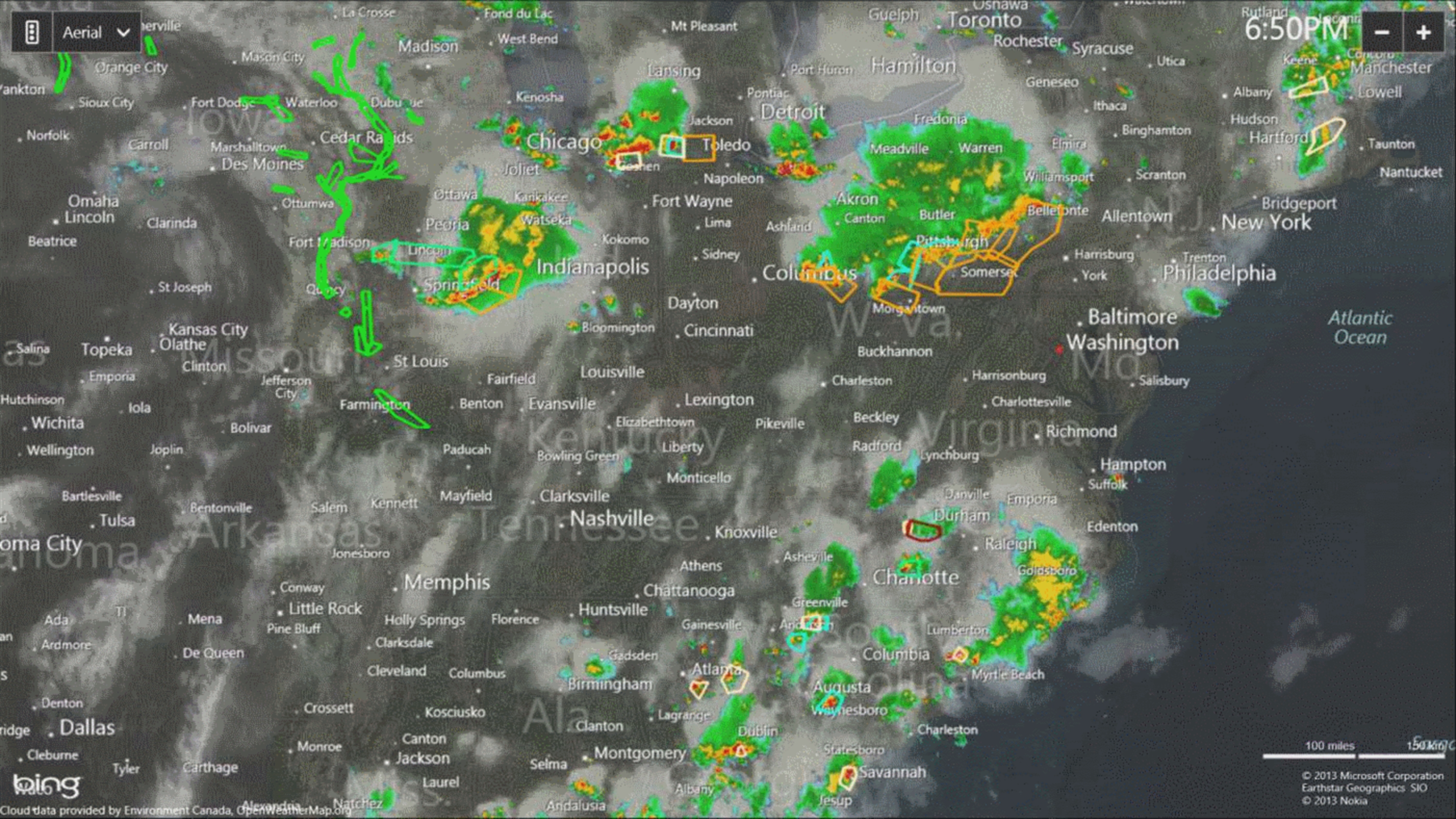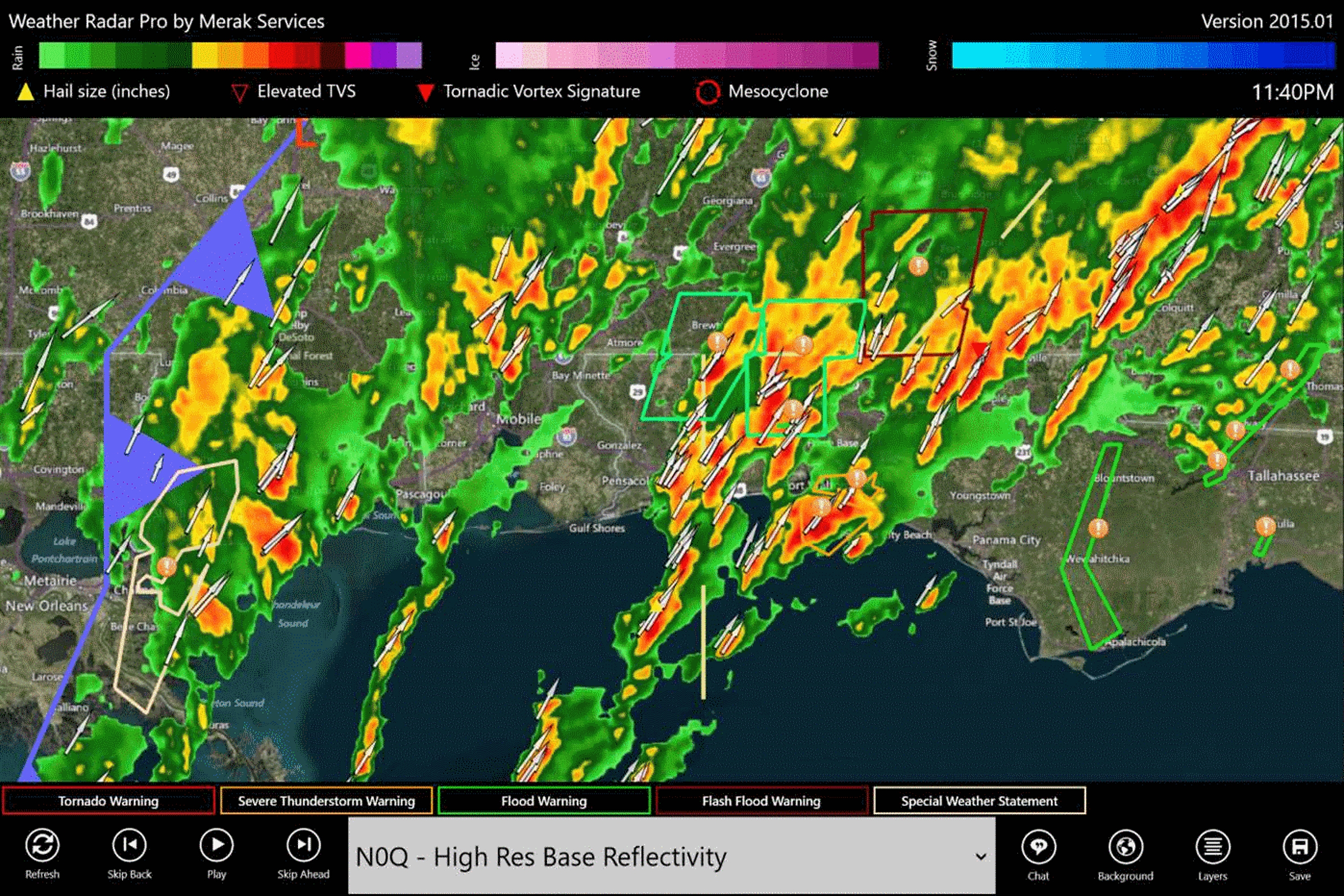 Radar meteorológico animado con cajas de observación / advertencia, seguimiento global de huracanes y superposiciones de nubes. Radar incluye atributos de tormenta - flechas que indican el sentido de la marcha, y los iconos que indican la ubicación y el tamaño del granizo, mesociclones y firmas de vórtices de tornados que indican la presencia de rotación en supercélulas y tornados posibles. Las imágenes de radar incluyen reflectividad alta resolución de base en múltiples ángulos de exploración, tops de eco mejoradas, líquido integrada verticalmente, coeficiente de correlación, la reflectividad diferencial, totales de precipitación 1 hora, y la precipitación total tormenta.