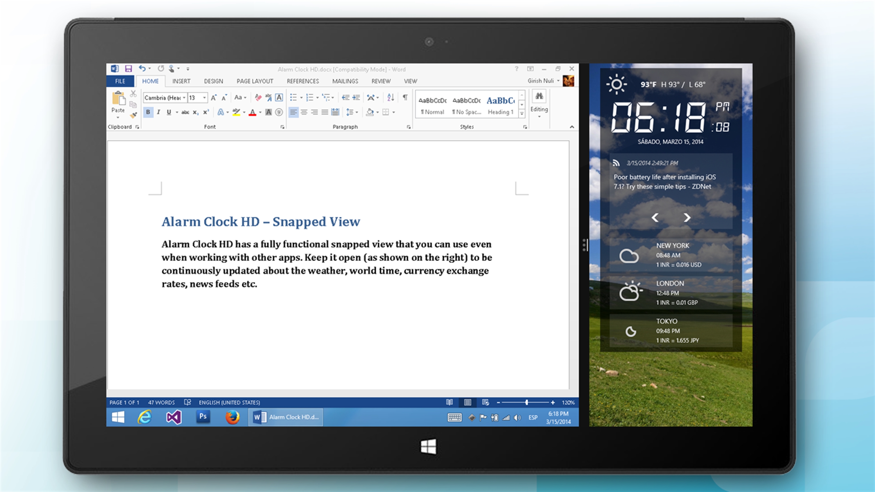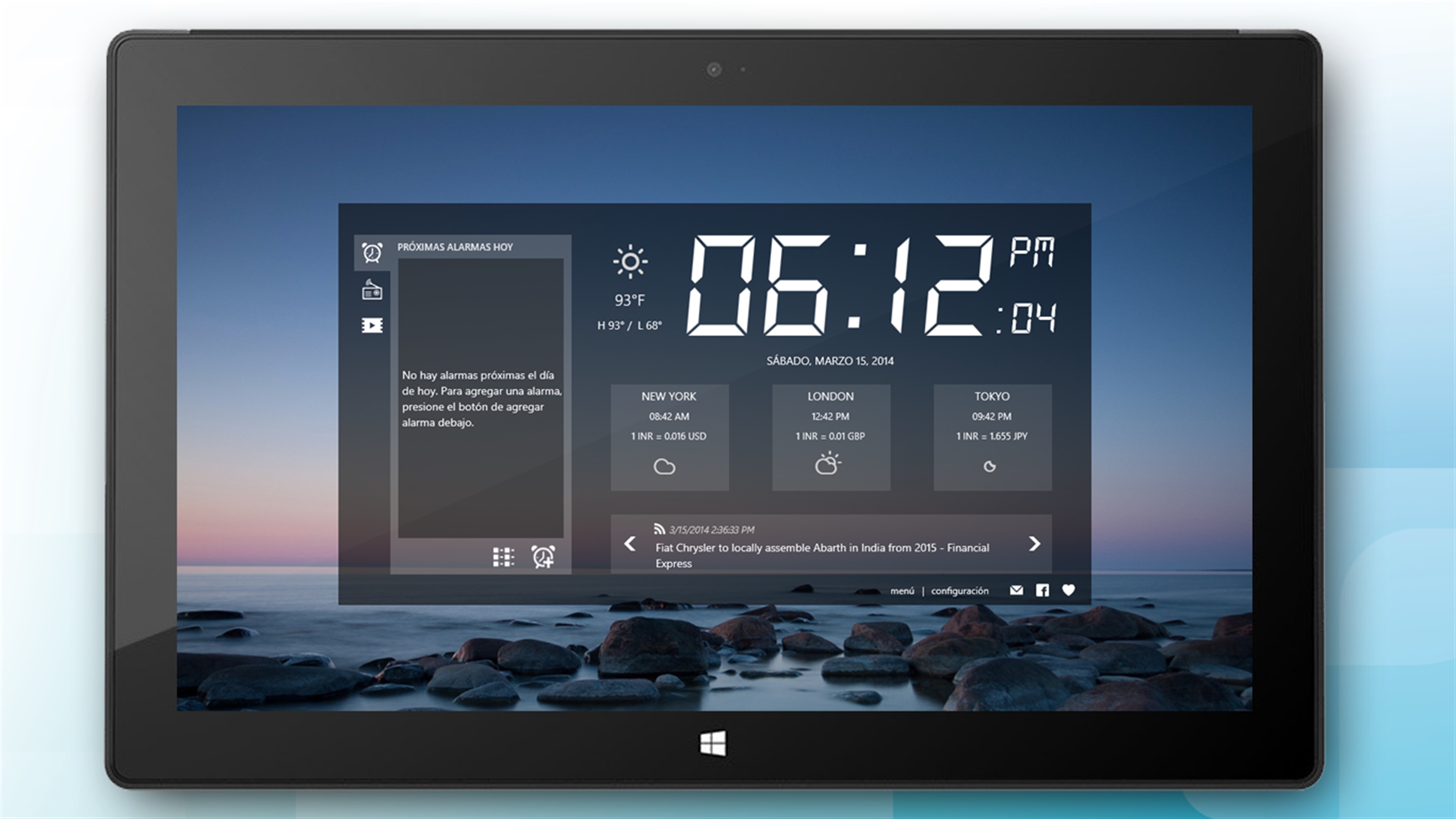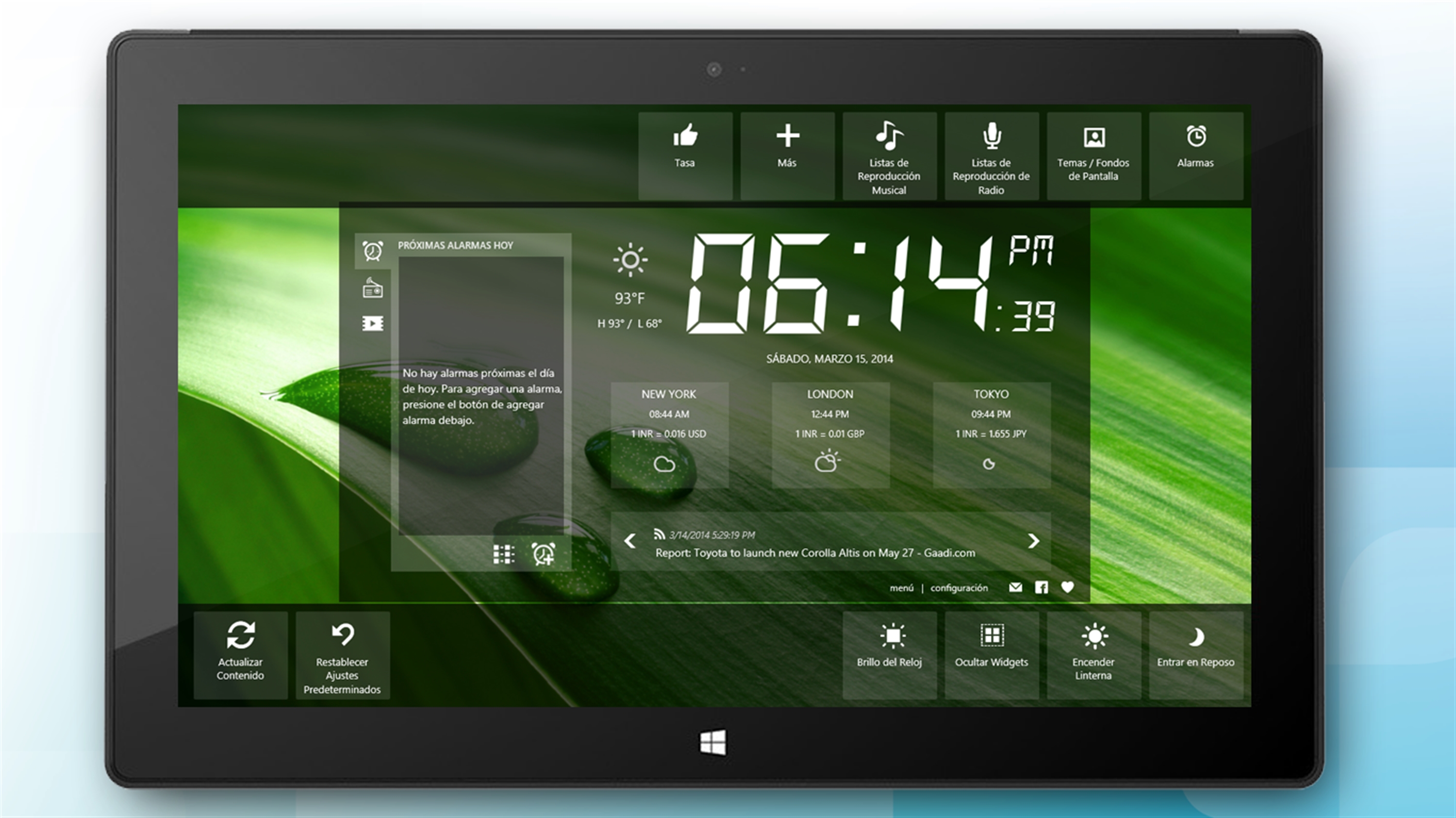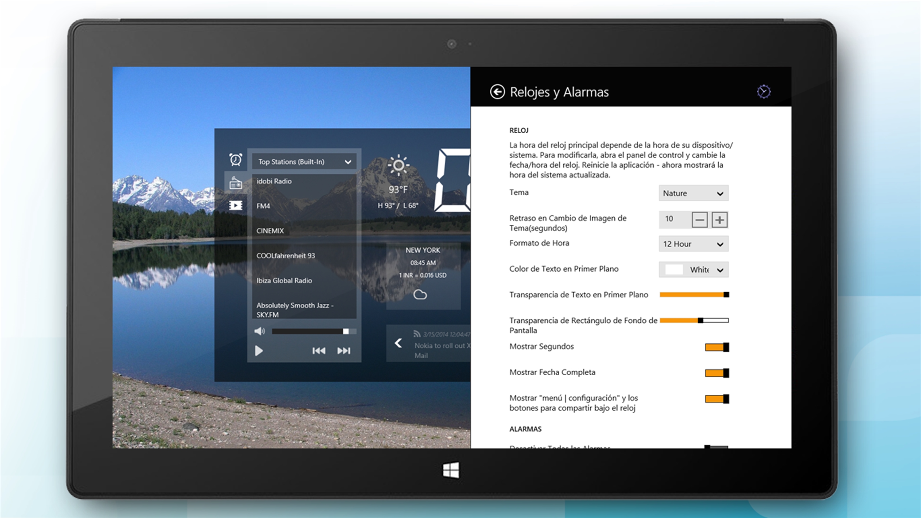 Alarmas itinerantes | Notificaciones Emergentes | Despertar de Reposo | Clima | Relojes Mundiales | Reproductor Musical | Reproductor de Radio | Facebook | Fuentes de Noticias RSS | Sonidos de Alarma - Integrados, Personalizados o de Radio | Música en Reposo y Temporizador | Temas con Imágenes – Integradas o las Suyas | Reloj Mosaico Dinámico | Sensor de Luz Ambiental | Vista Recortada Funcional | Totalmente Personalizable