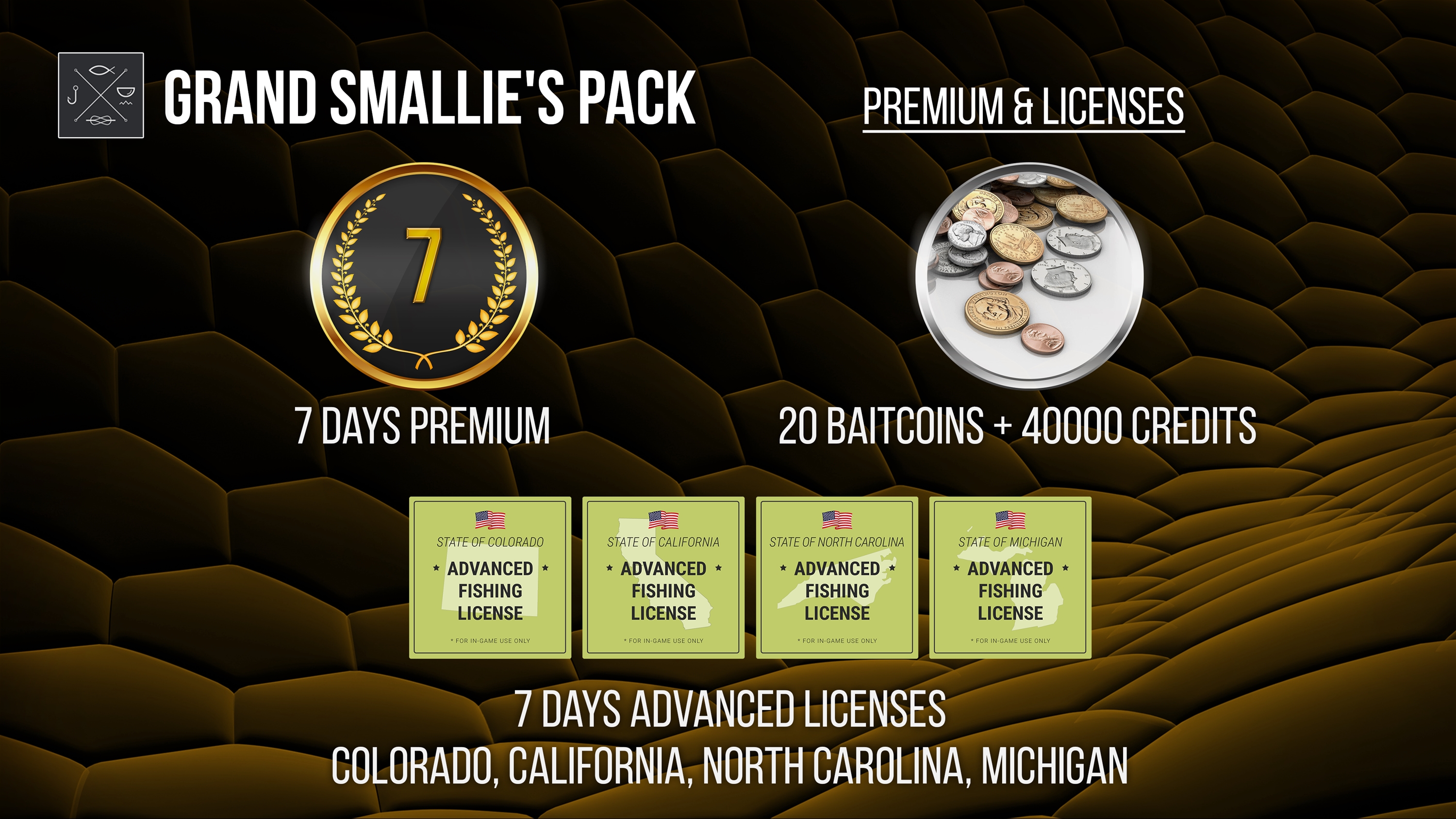 * 20 BAITCOINS - use to purchase certain fishing tackle, available only for BaitCoins. Spend your BaitCoins wisely!