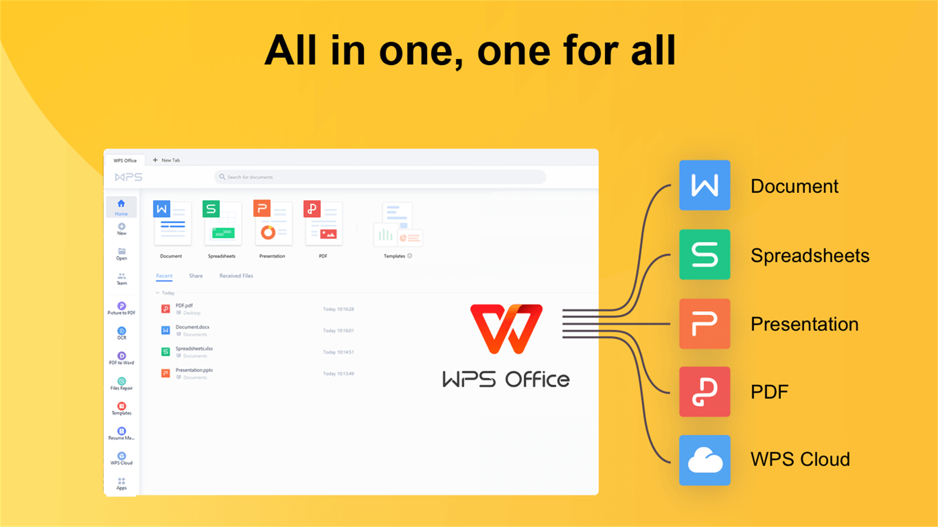 WPS Office is an all-in-one office suite to view and edit multiple types of files, including PDF, Word, Excel, PowerPoint, and Forms. It also provides features such as Cloud Storage, Template Library, and Sharing.