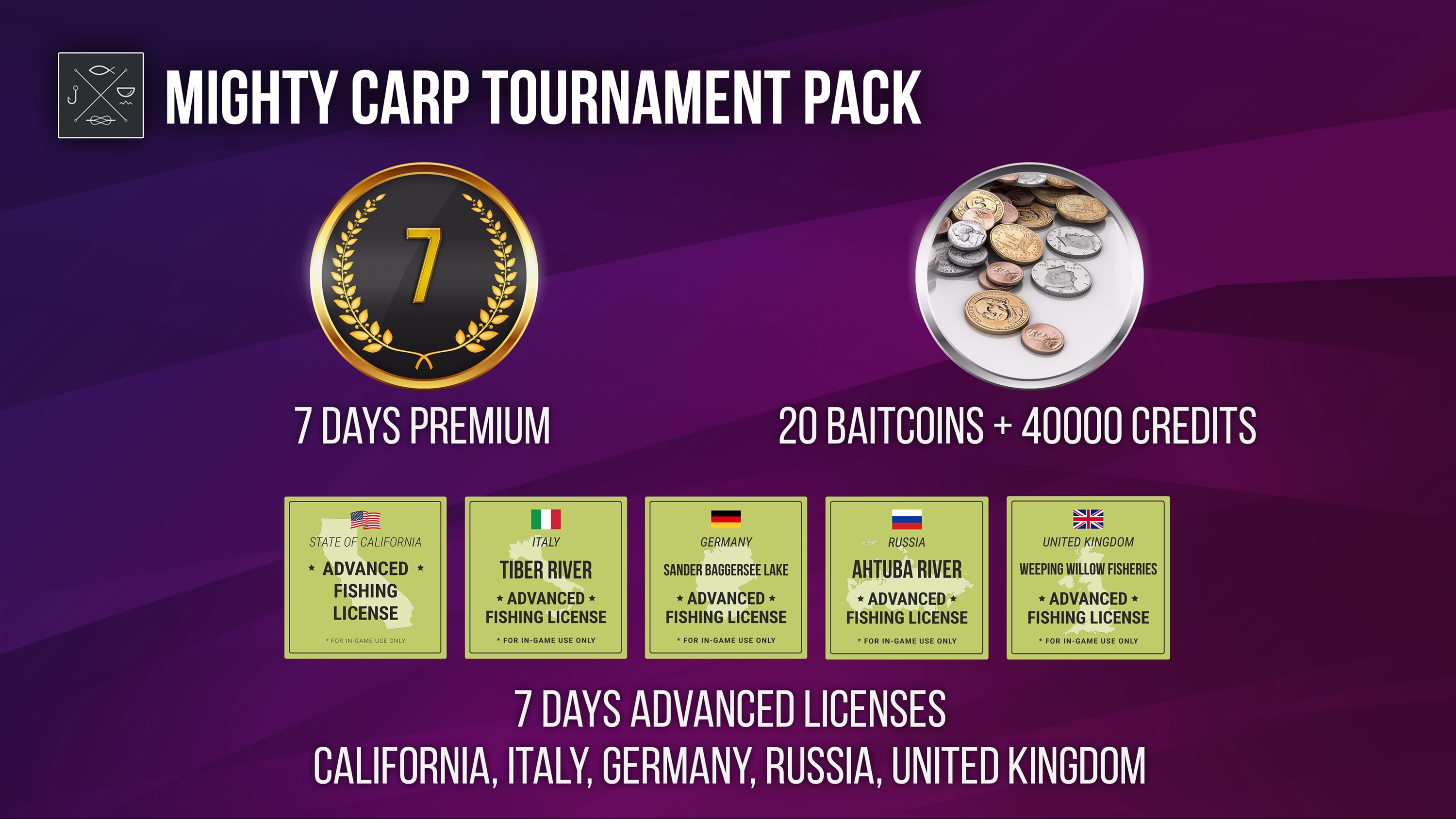 * 7 DAYS OF PREMIUM ACCOUNT Enjoy seven days of Premium Status and advance your game progress by getting a 50% boost to Experience and Credits earned for every fish you catch! In addition, you get the opportunity to rent a kayak with a 50% discount! You also get the privilege of free registration in Competitions and the advantage of using free Forward Time function twice as often!