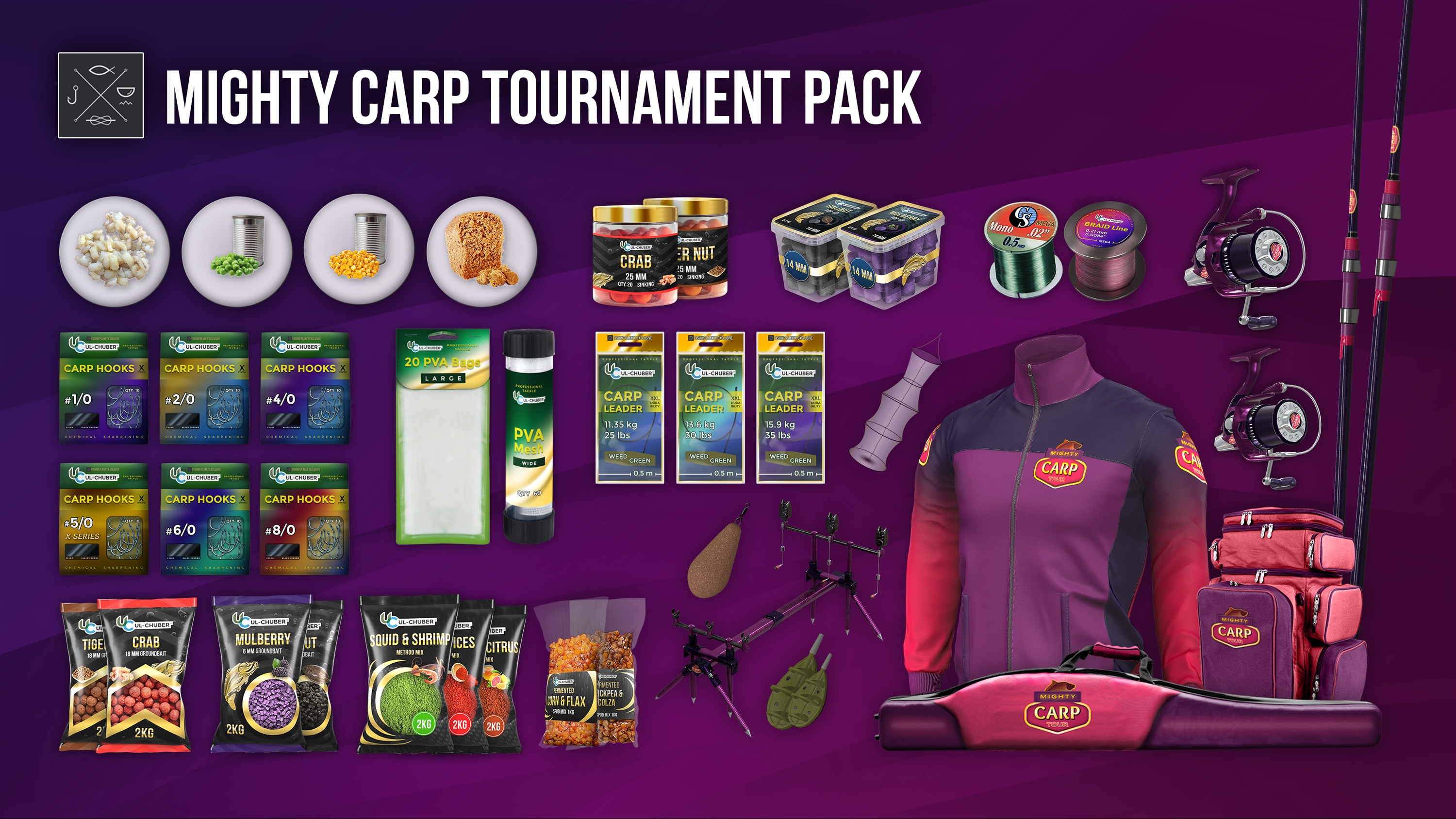 Mighty Carp Tournament Pack is a splendidly assembled tackle kit that has everything you need, even if your plans include becoming the Champion of Mighty Carp Tour! Yep, it has a full set of first class Tournament tackle that not only ranks as exclusive collectibles but also guarantees the ultimate angling performance! With Mighty Carp Pack you get a couple of MCT McCarp™ most powerful carp rods in history, the MCT CarpAxel™ super efficient spinning reels, the limited edition MCT FishBelly™ rod case, MCT ChumChest™ lure box and even the ultra slick MCT Carpster™ fishing jacket. You also get a whole bundle of goodies including all the terminal tackle, equipment and licenses you need to enjoy your Carp fishing experience, regardless of whether or not you’ll choose to take on the Tournament challenge.
