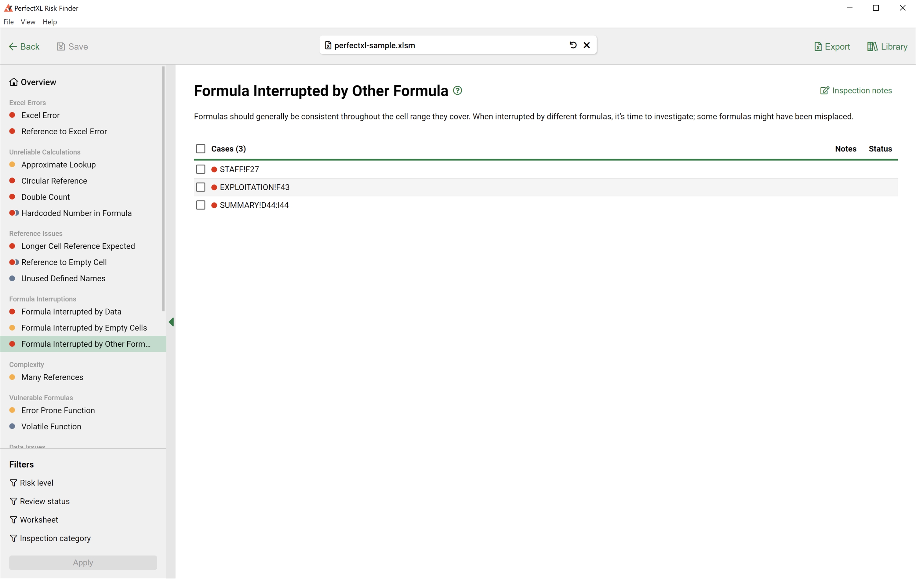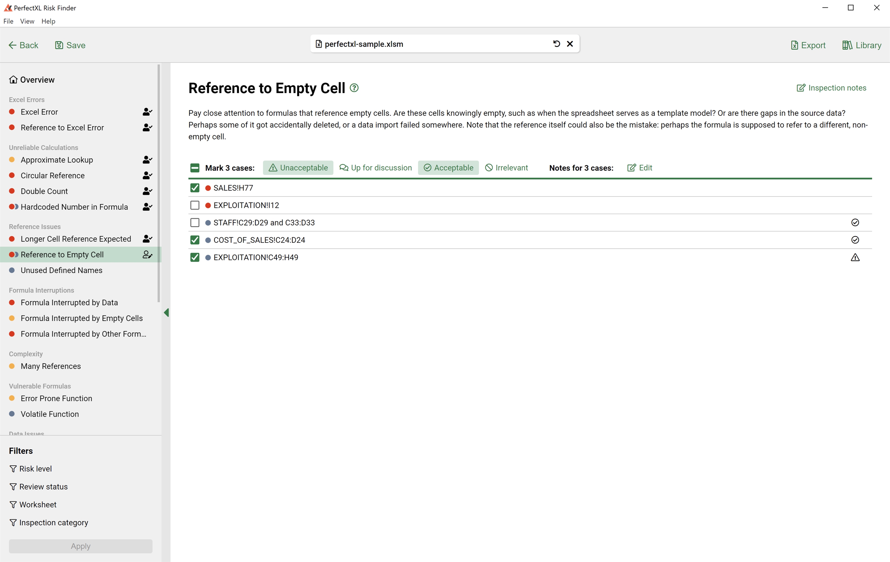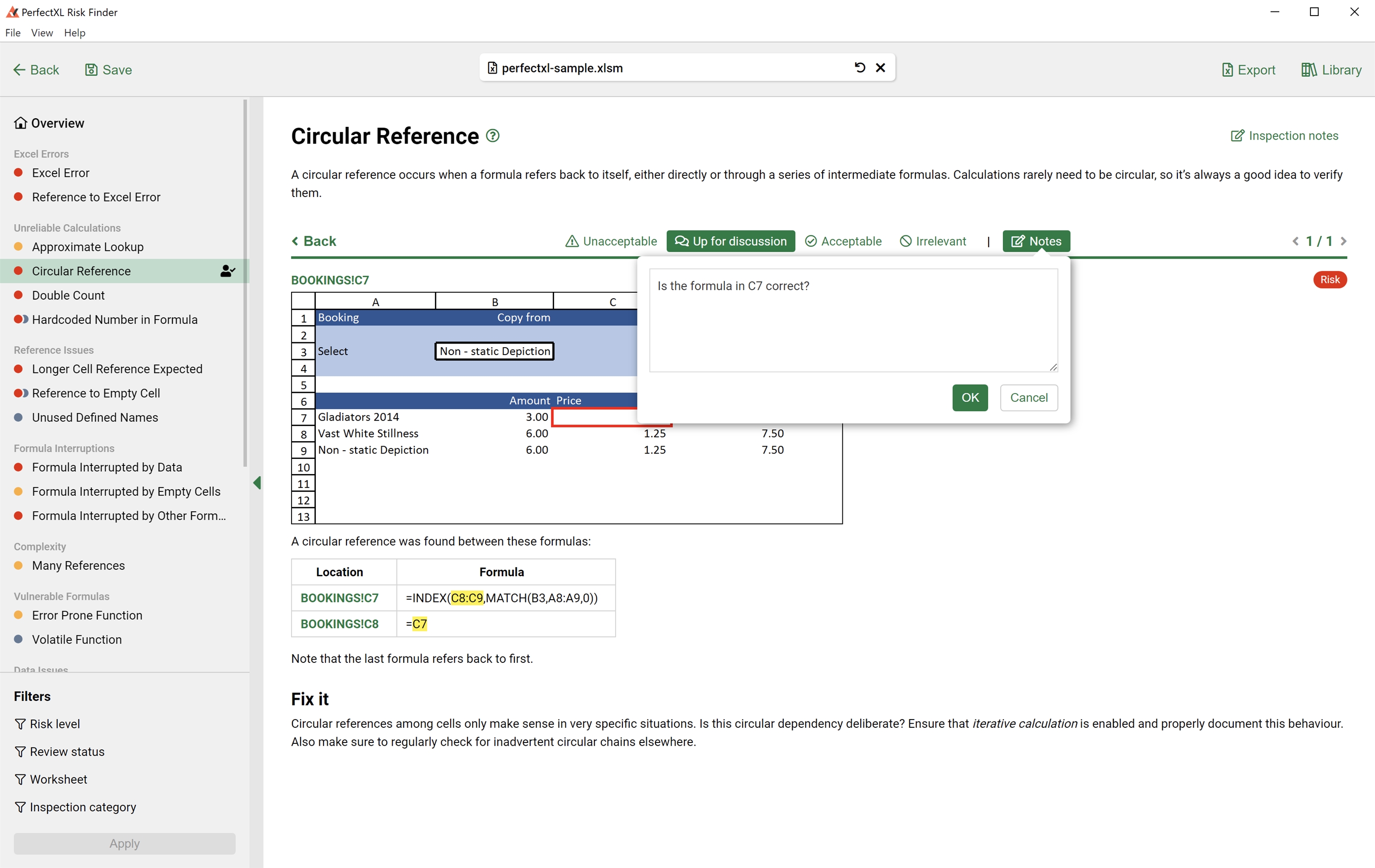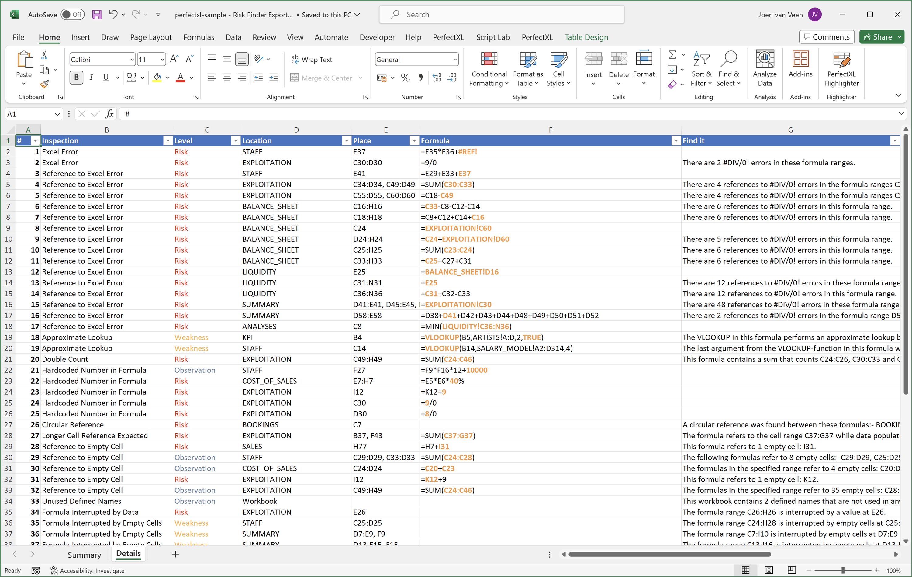 The PerfectXL Risk Finder is a tool that helps you automate and standardize the process of validating/auditing spreadsheets. See formulas with hard coded numbers, circular references, interrupted formulas and so much more! Audit the findings by adding a status in the tool and generate a full report of all findings.