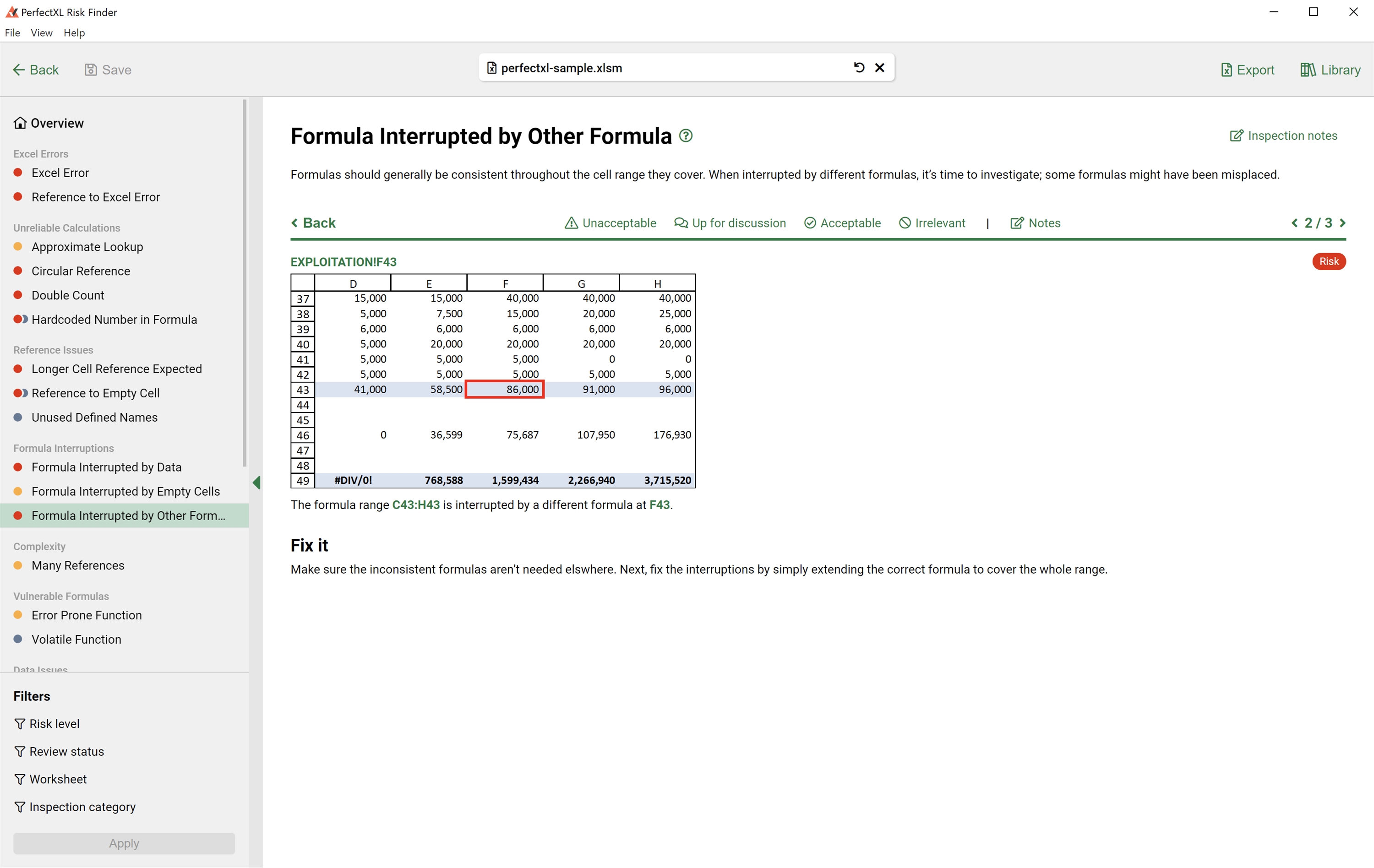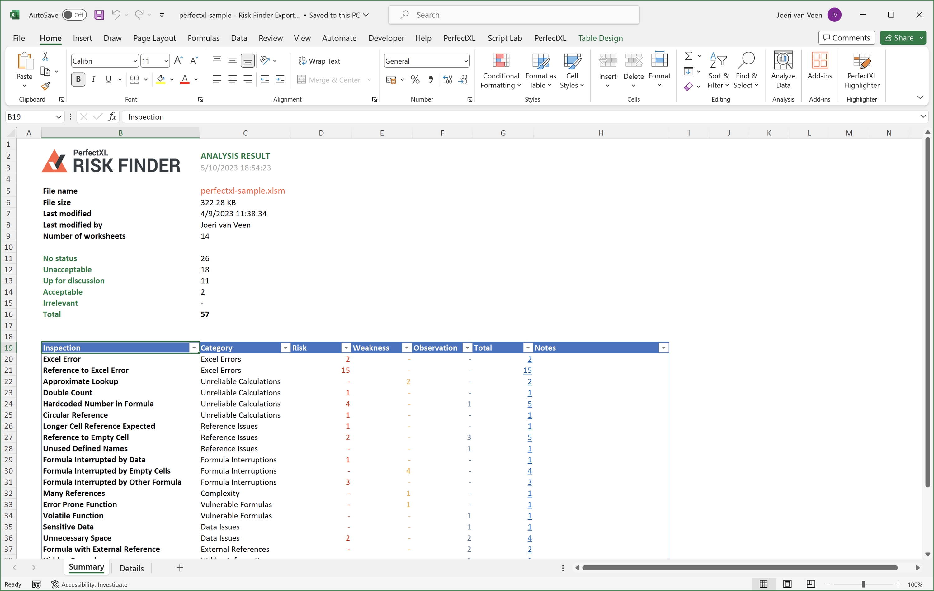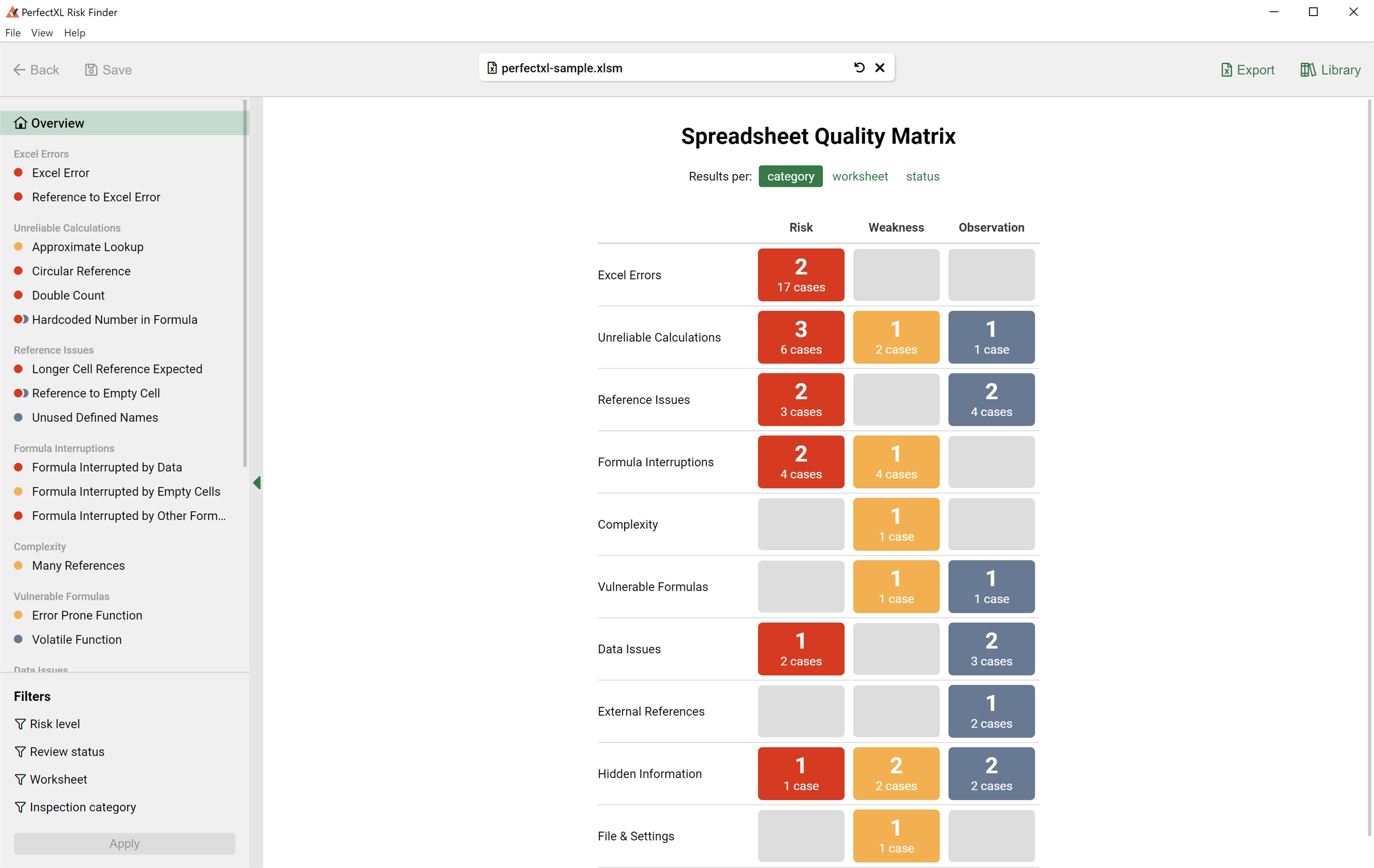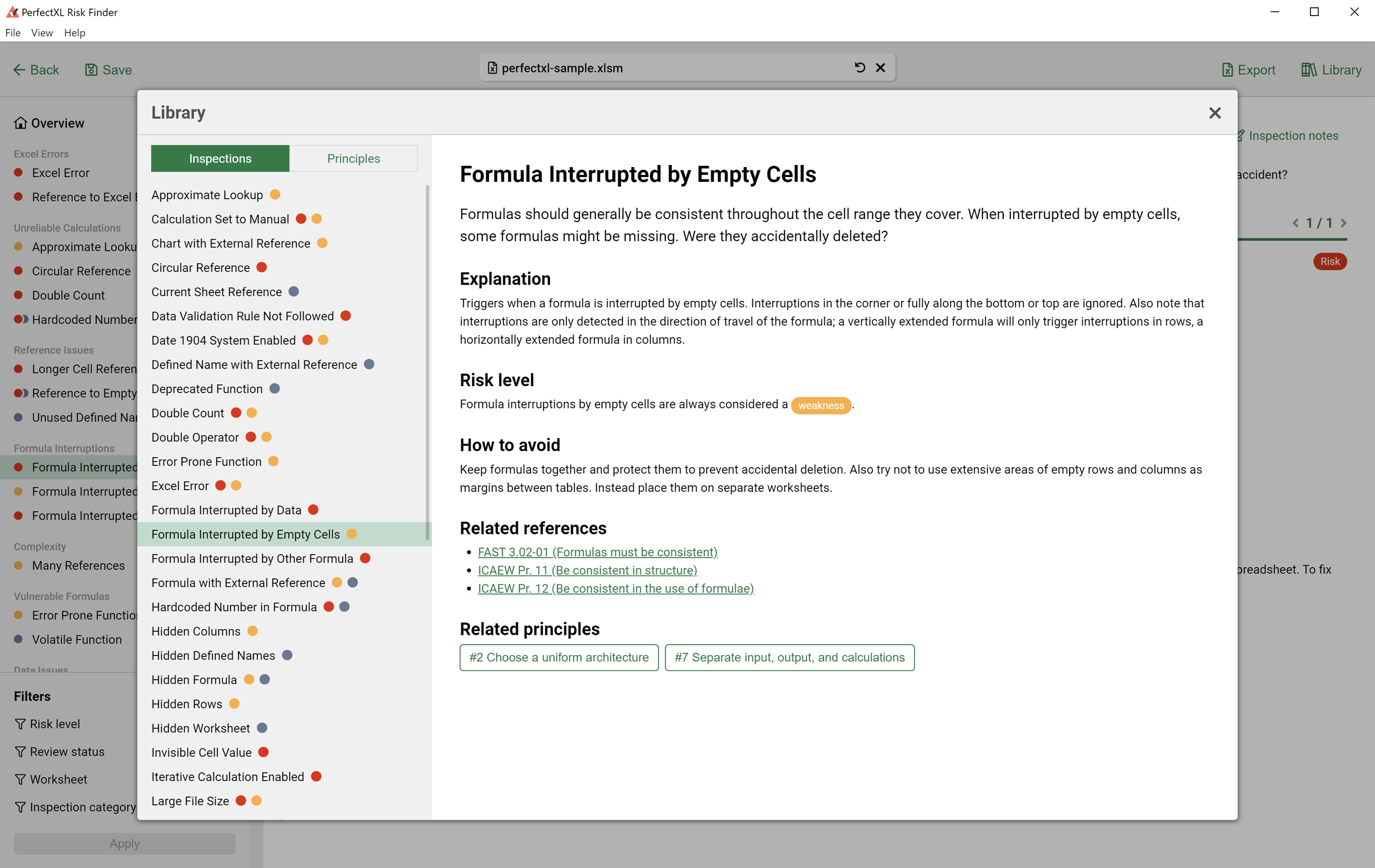 The PerfectXL Risk Finder is a tool that helps you automate and standardize the process of validating/auditing spreadsheets. See formulas with hard coded numbers, circular references, interrupted formulas and so much more! Audit the findings by adding a status in the tool and generate a full report of all findings.