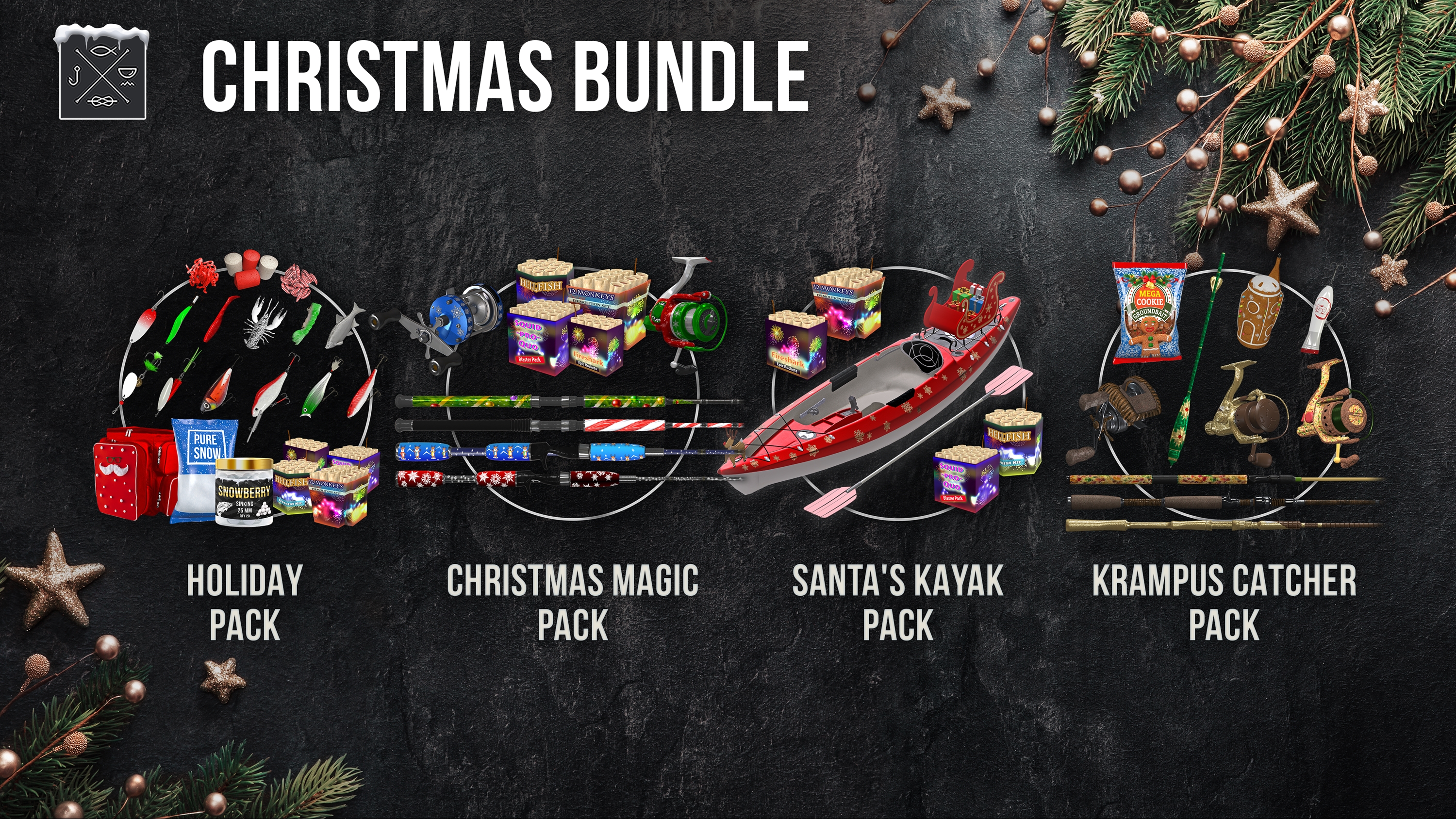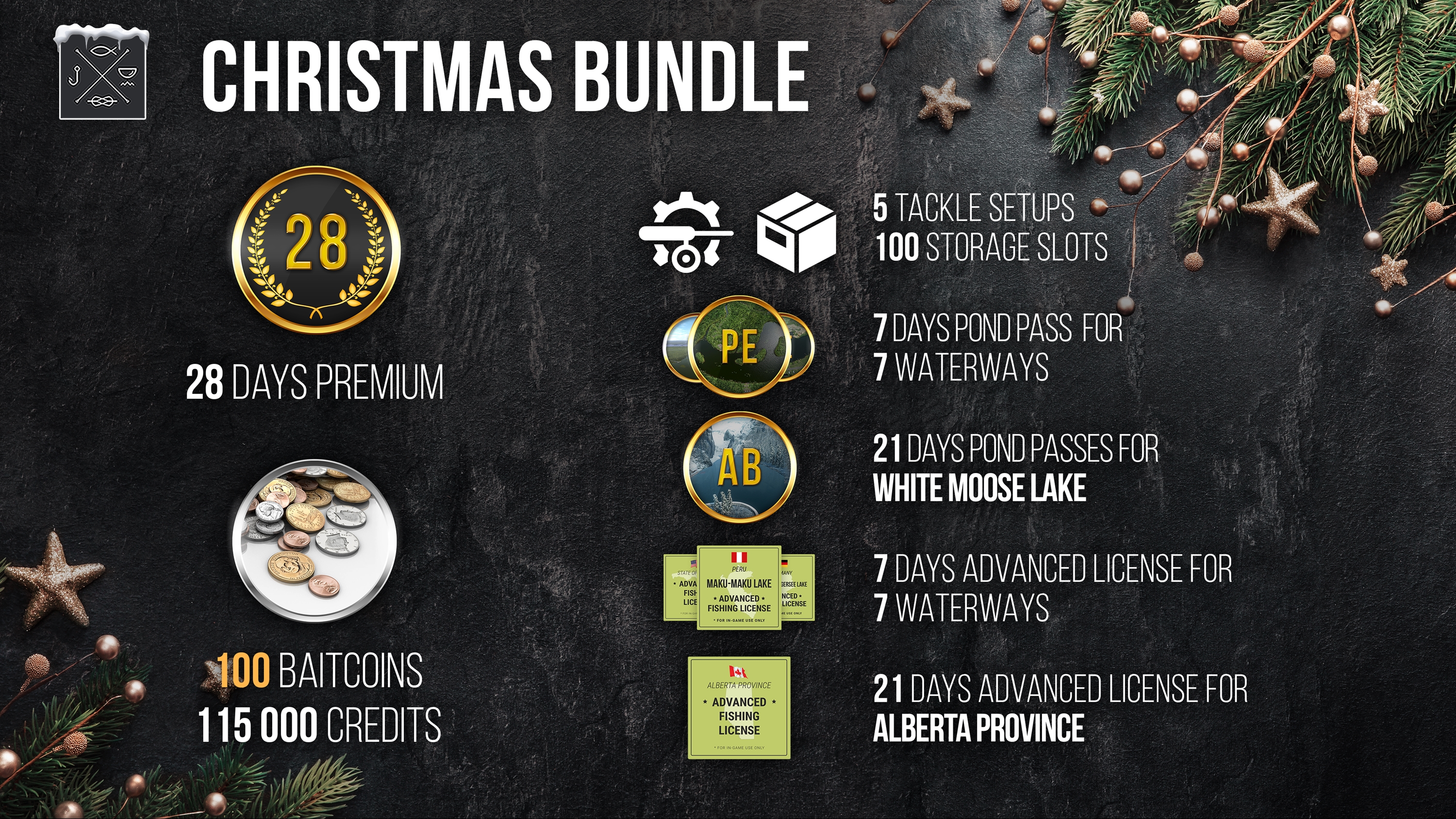 The wonderful Fishing Planet Christmas Bundle is full of amazing gifts! See for yourself: by purchasing this bundle you SAVE 25% and get the game and as many as FOUR PACKS with a nice selection of our limited edition Christmas tackle and equipment, as well as some festive fireworks and even a New Year kayak! And what’s more, the set includes an Advanced License and Pond Passes for Florida (Everglades), Germany (Sander Baggersee Lake), Peru (Maku-Maku Lake) and Alberta (White Moose Lake)! And, of course, the kind Santa wouldn’t forget to bring you a whole week of Premium, BaitCoins, Credits, and many more incredible treats for an unforgettable Christmas fishing experience!