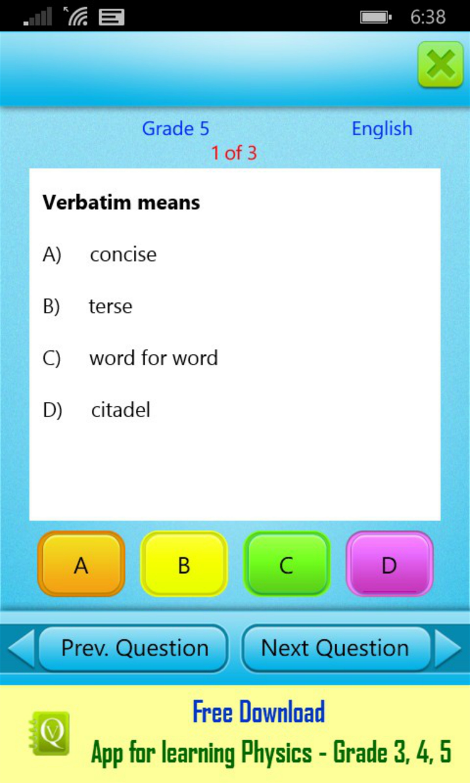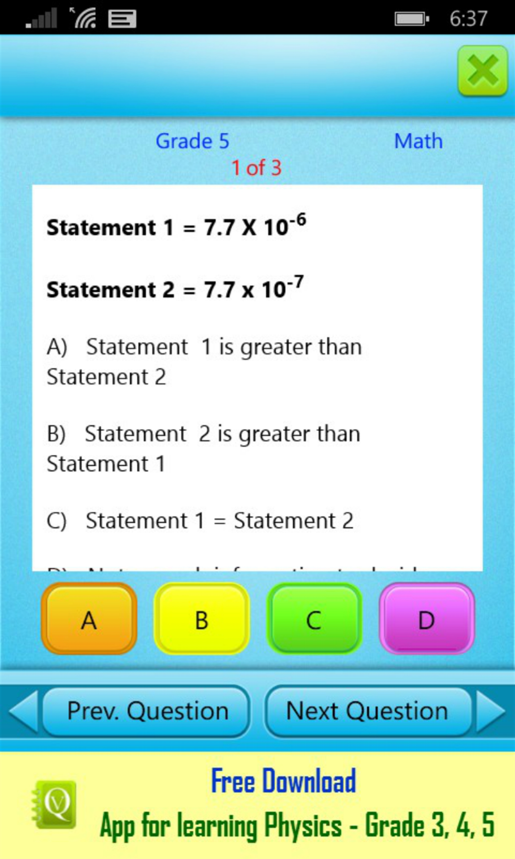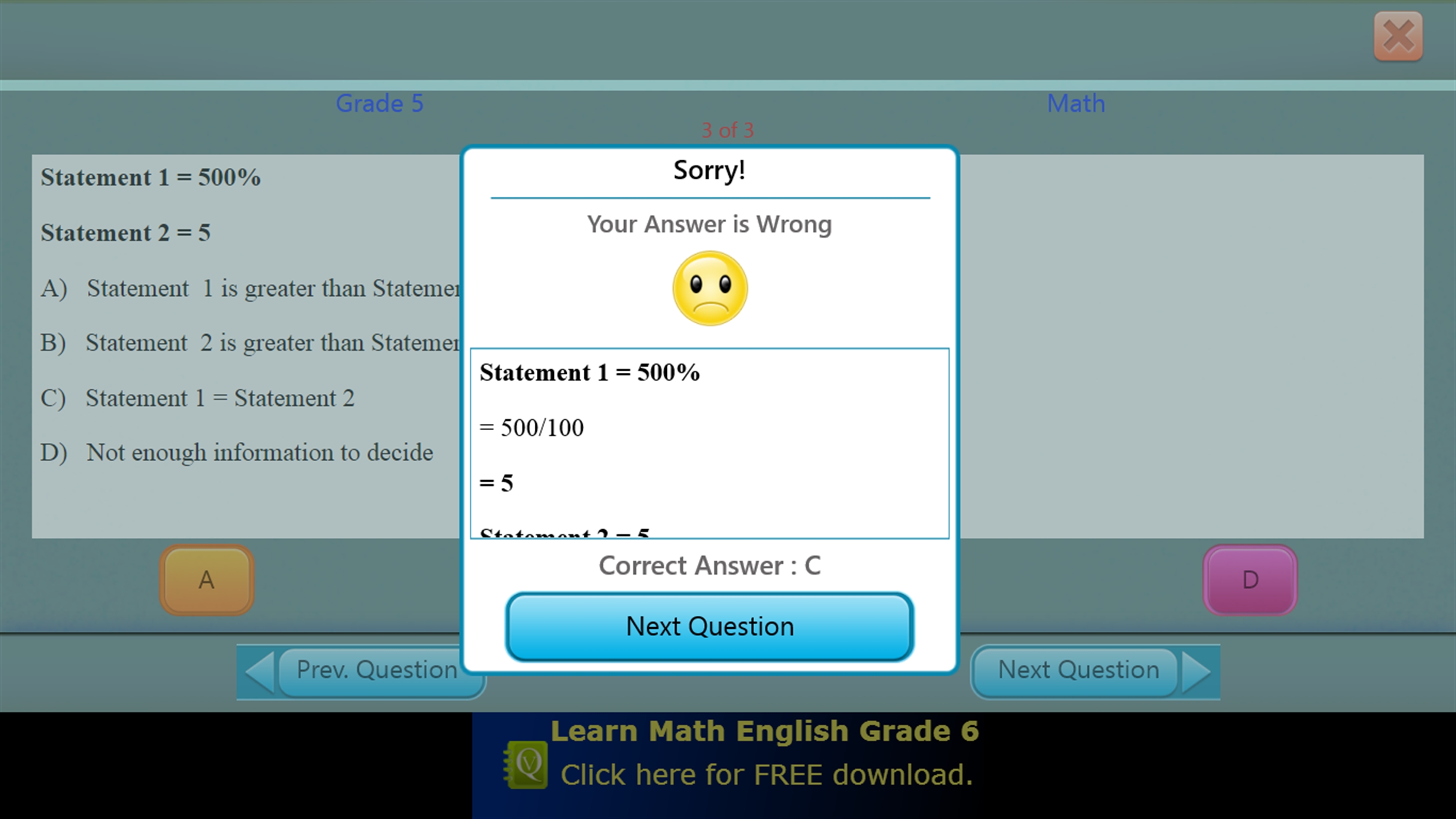 If you answer wrong, the correct answer with detailed explanation is displayed which improves learning. If you like the app, you can buy the paid version QVprep 5.