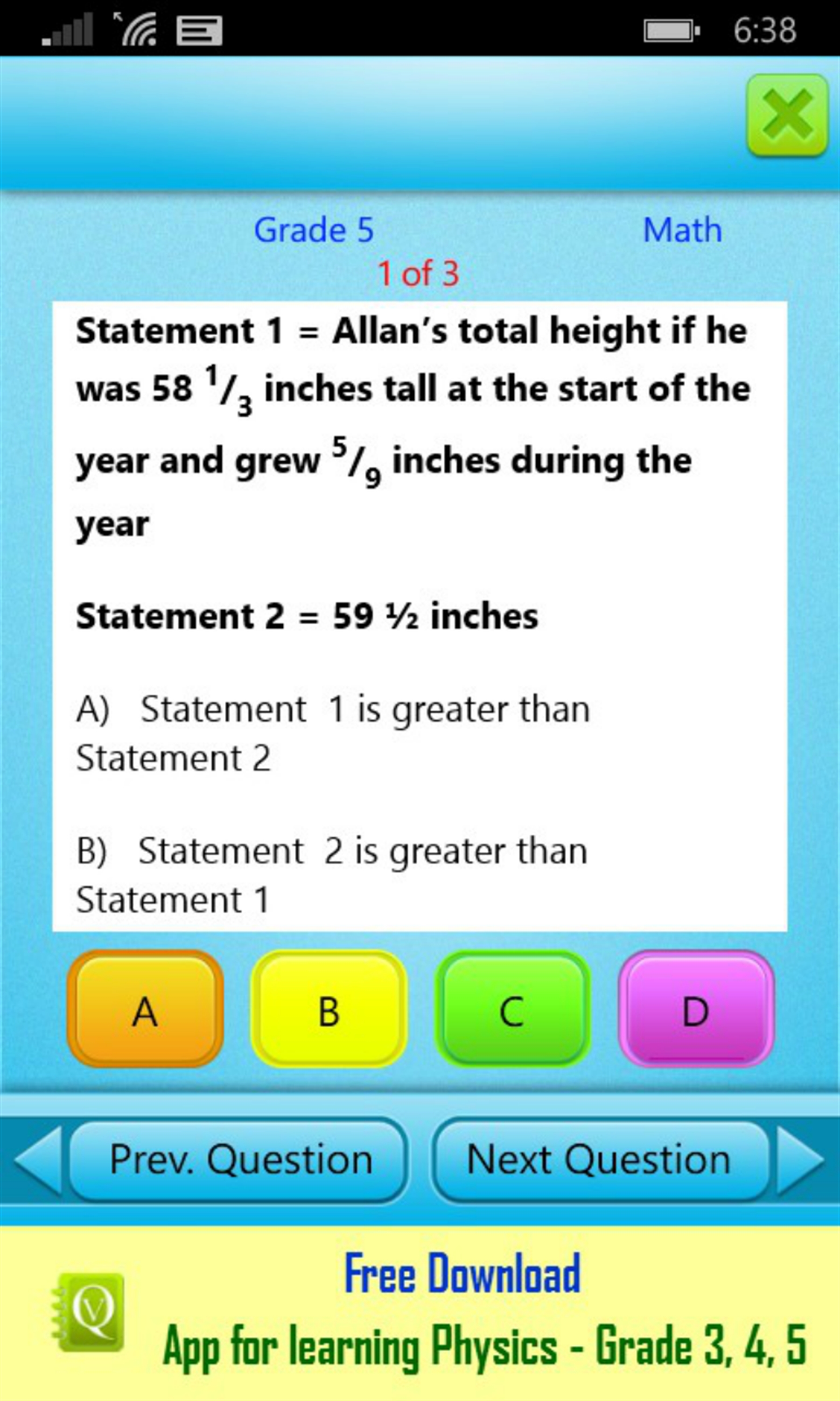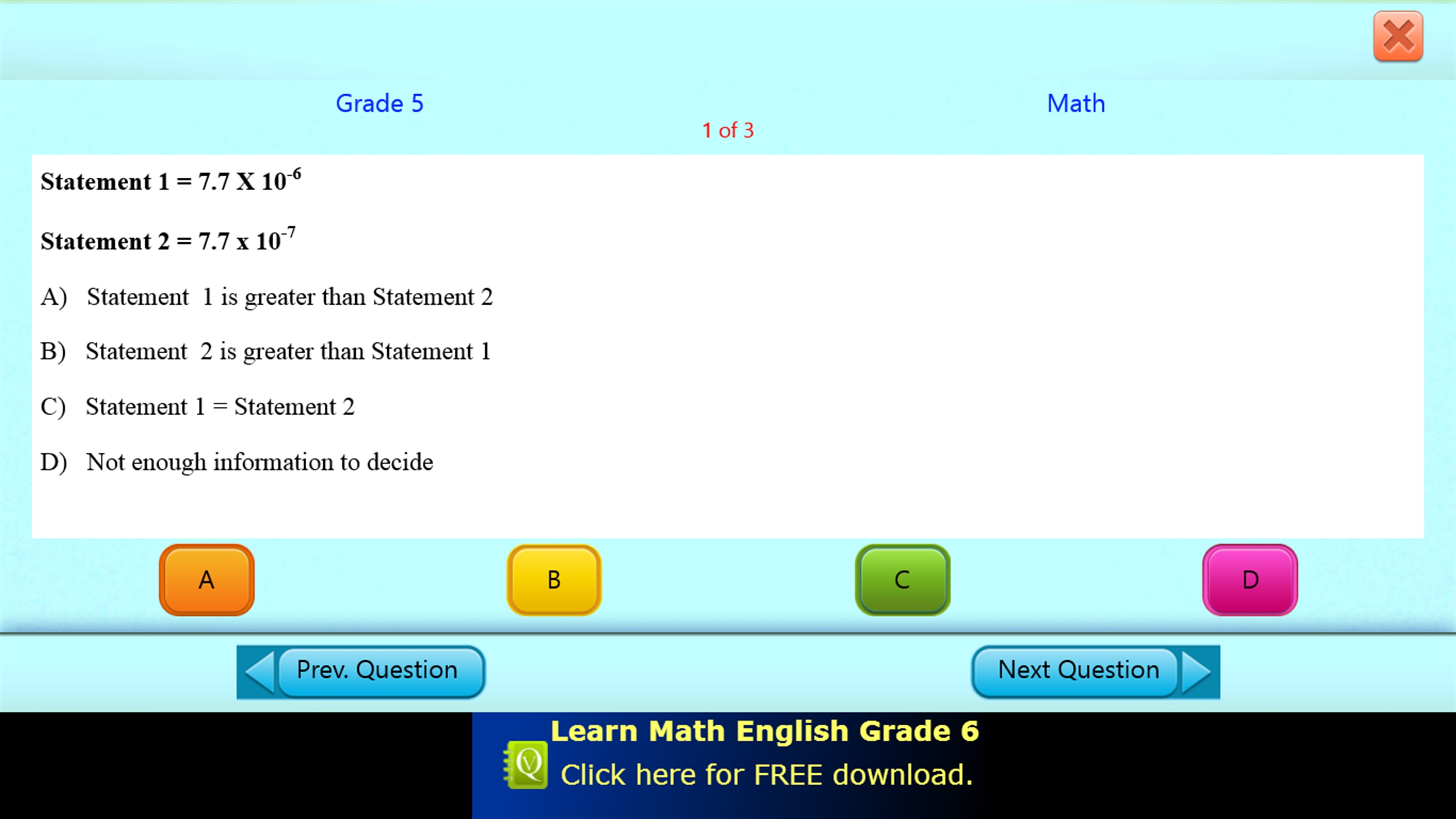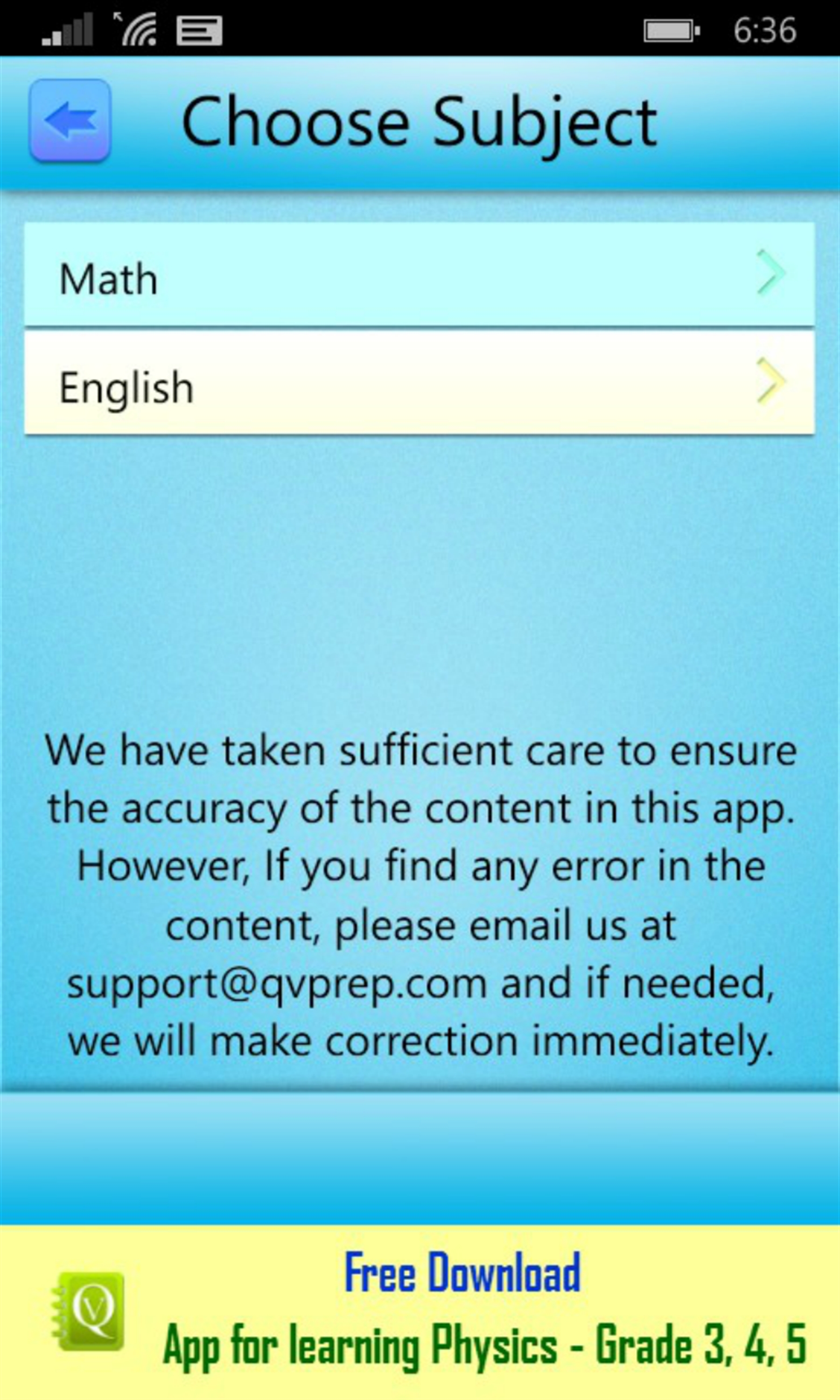 If you answer wrong, the correct answer with detailed explanation is displayed which improves learning. If you like the app, you can buy the paid version QVprep 5.