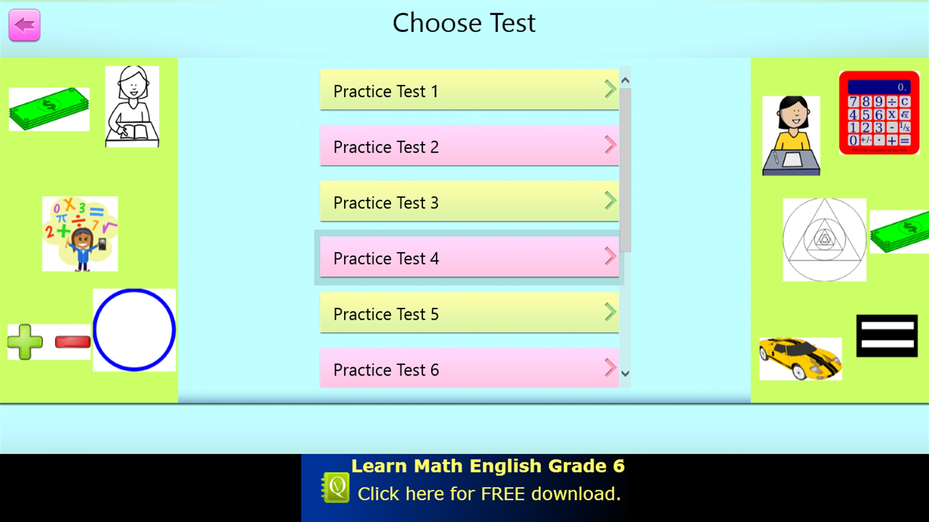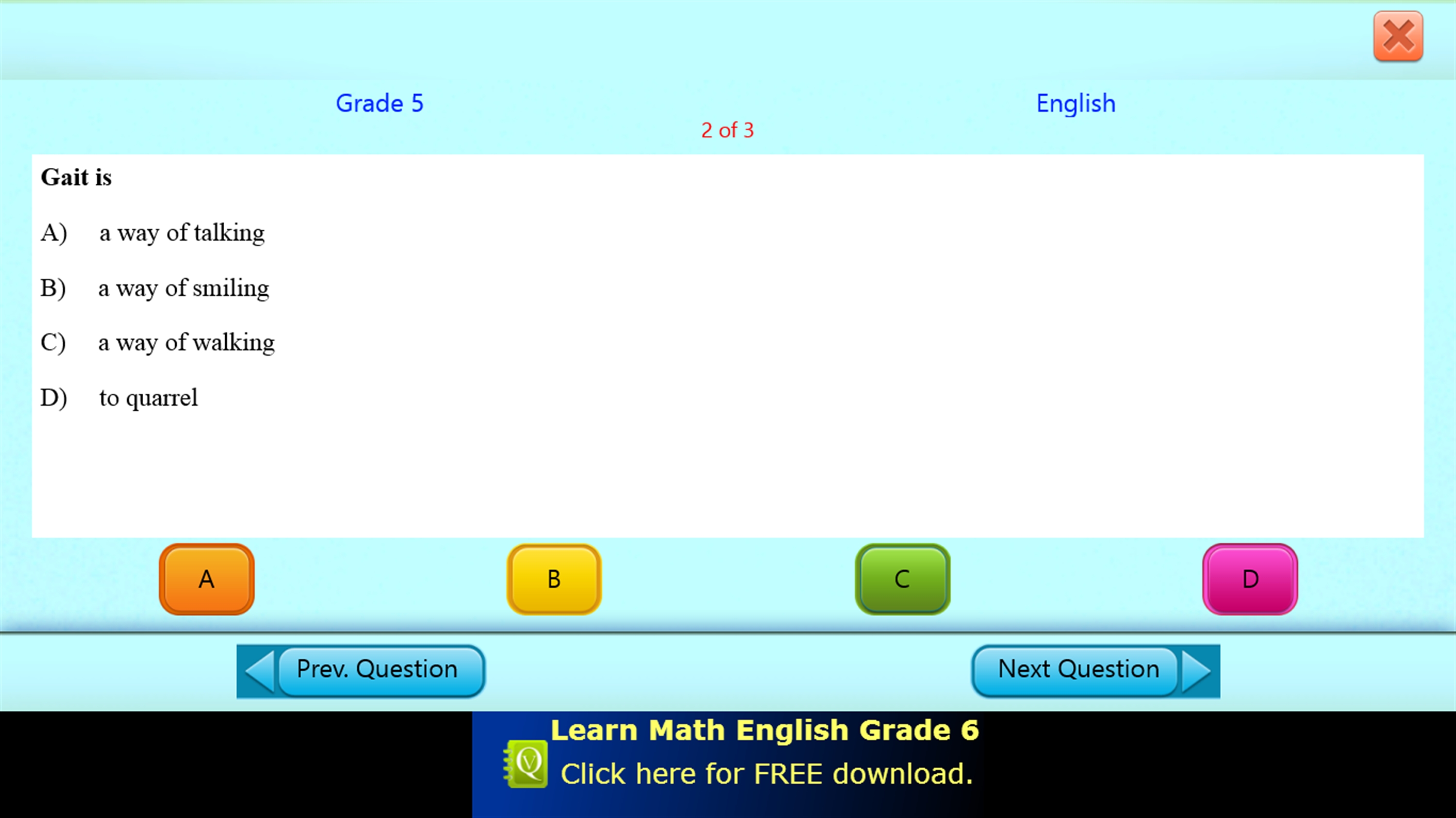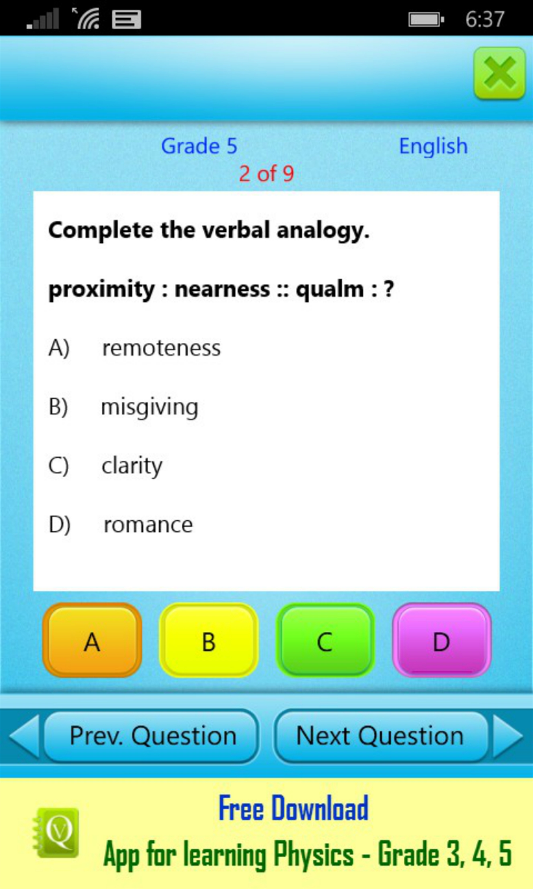 The QVprep Lite grade 5 app has ten practice tests each in quantitative and verbal ability. Each practice test has sample multiple choice questions for you to try out.